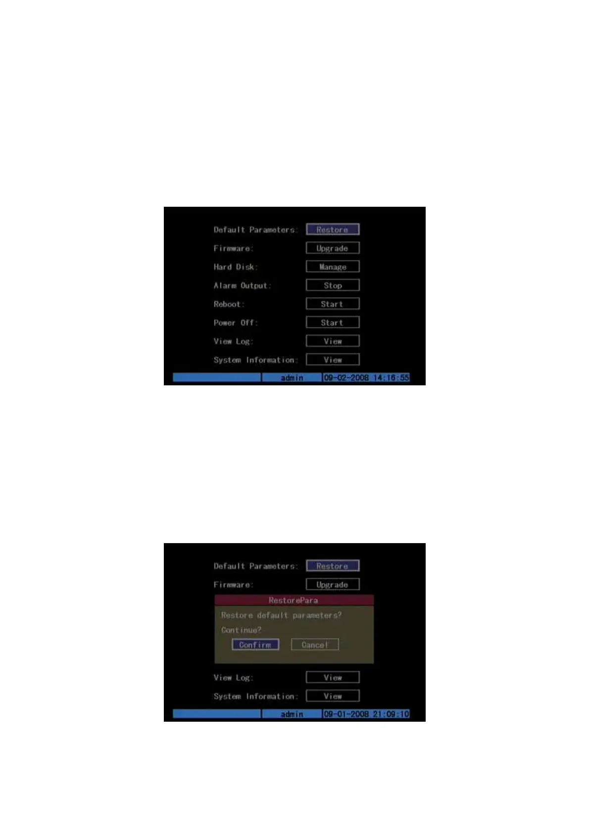 “Firmware”, “Hard Disk”, “Alarm Out”, “Reboot”, “Power Off”, “View Log” and