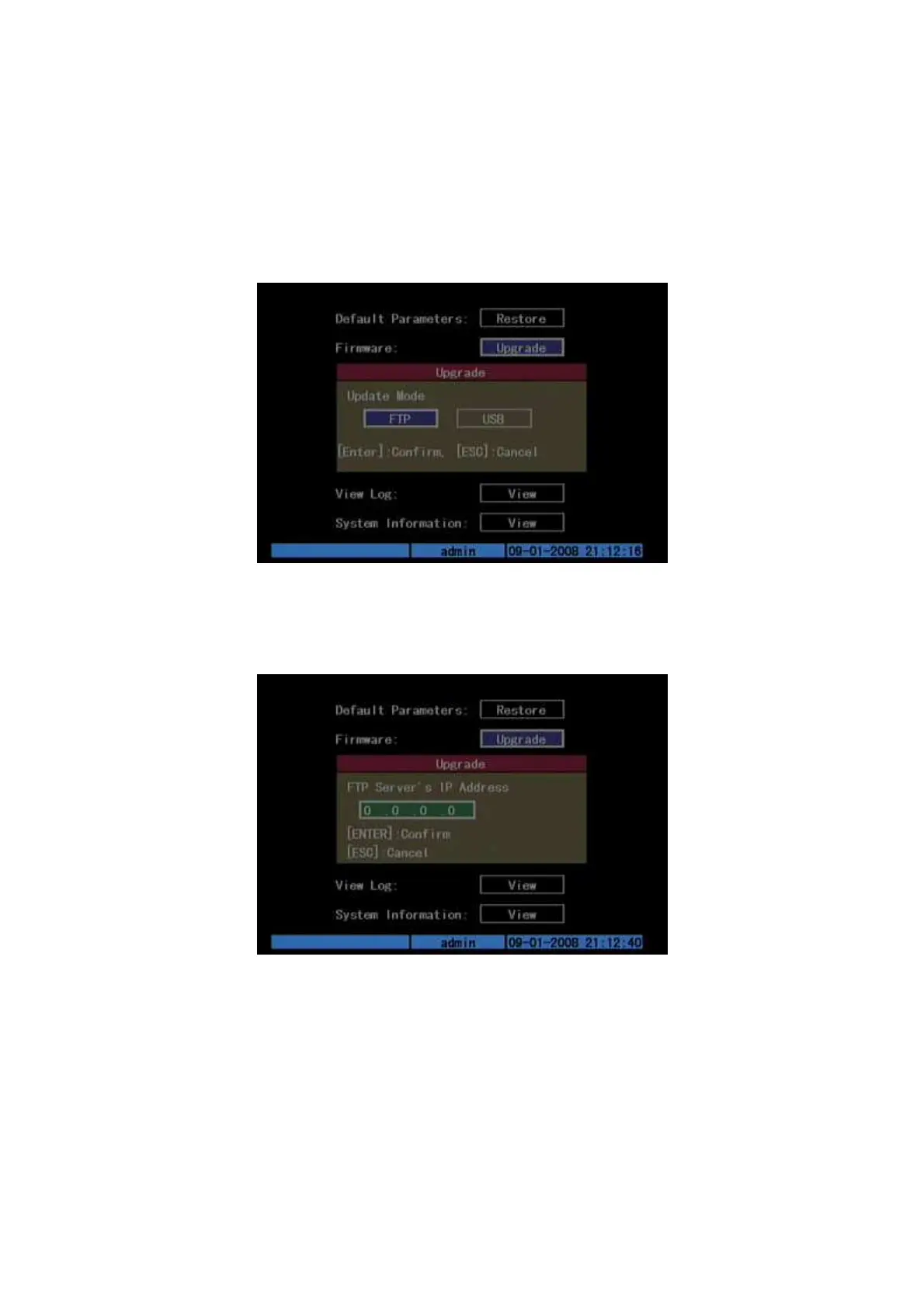 If you select “FTP” mode, you will enter “FTP Upgrade” menu: