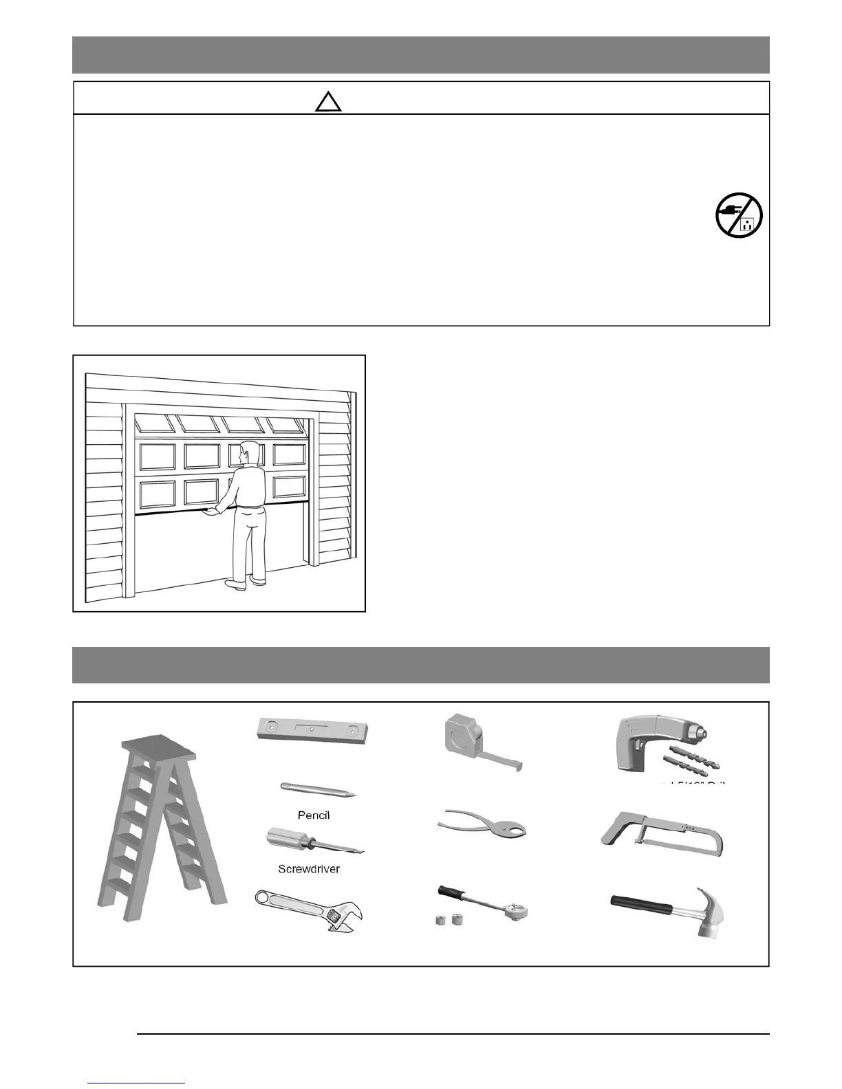 - DISABLE ALL LOCKS and REMOVE ALL ROPES connected to the garage door BEFORE installing