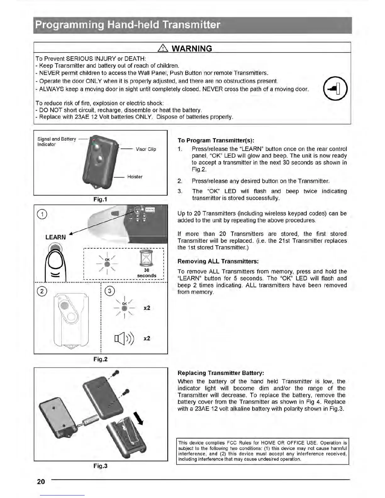 Guardian 628 - Programming Hand-held Transmitter; To Program Transmitter(s); Removing ALL Transmitters; Replacing Transmitter Battery