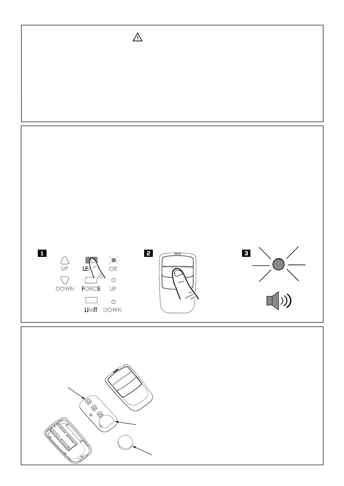 To remove ALL Remote Controls from memory, press and hold the “LEARN” button for 3 seconds. The “OK” LED will ash