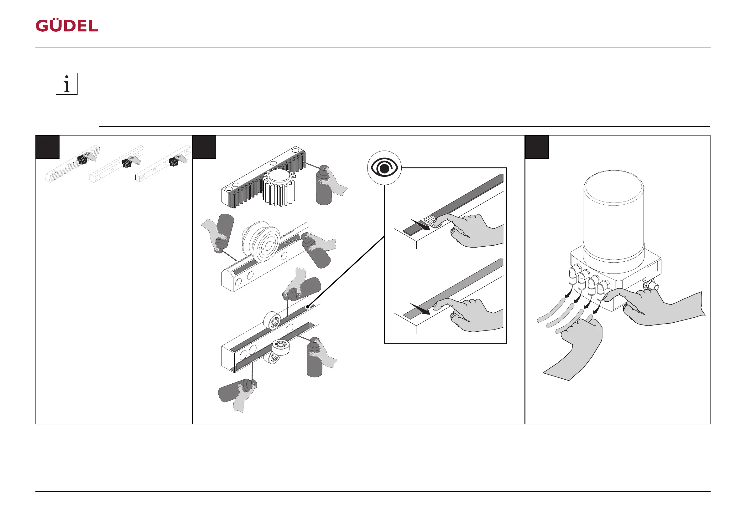 • As operator, check the lubrication system during initial commissioning, after downtimes of more than 4 weeks, if there is no lubricating film and after the cartridge or pump of the lubrication sys-