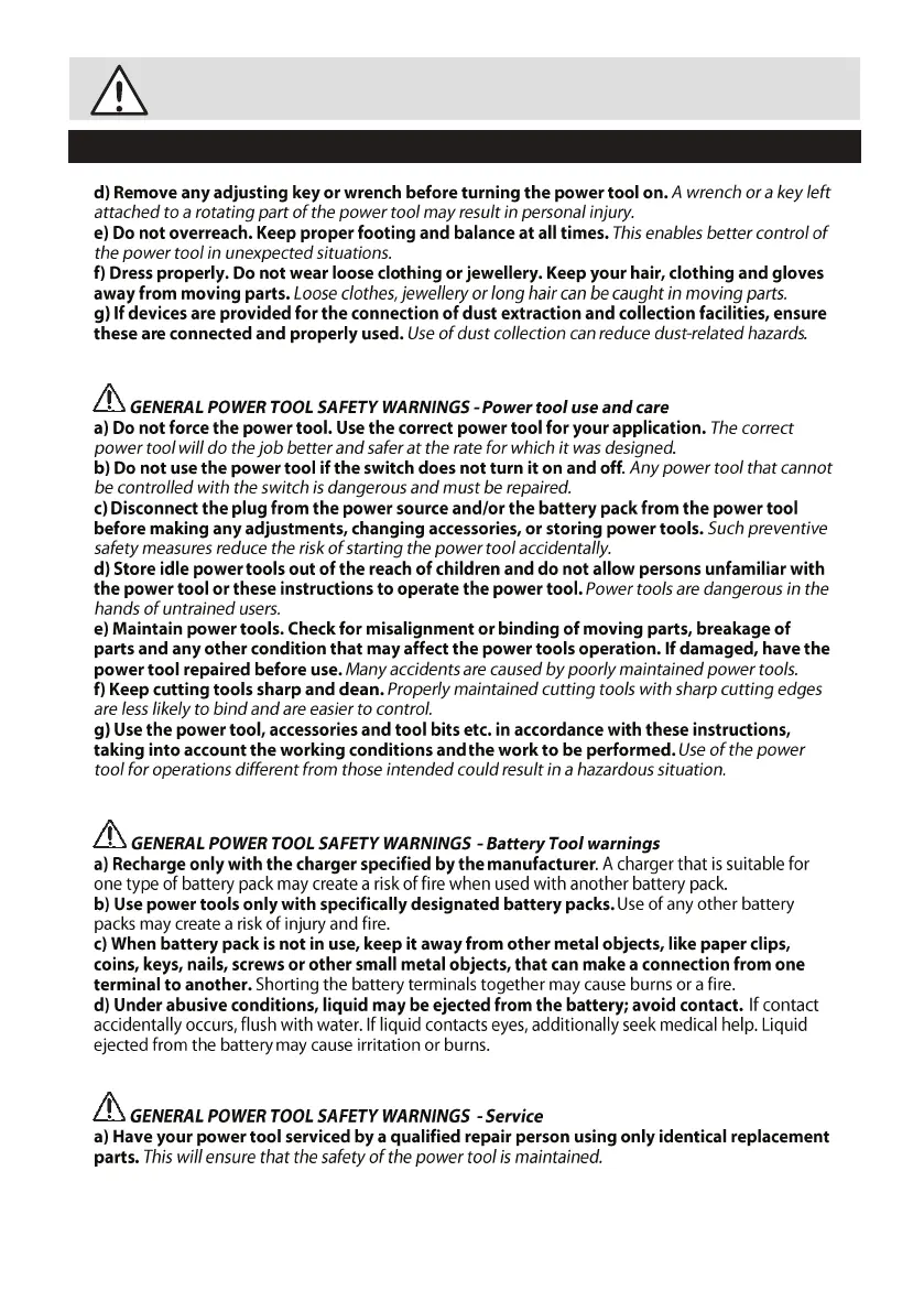 Guild CAP110D-12 - General Power Tool Safety Warnings; Power tool use and care; Battery Tool warnings; Service