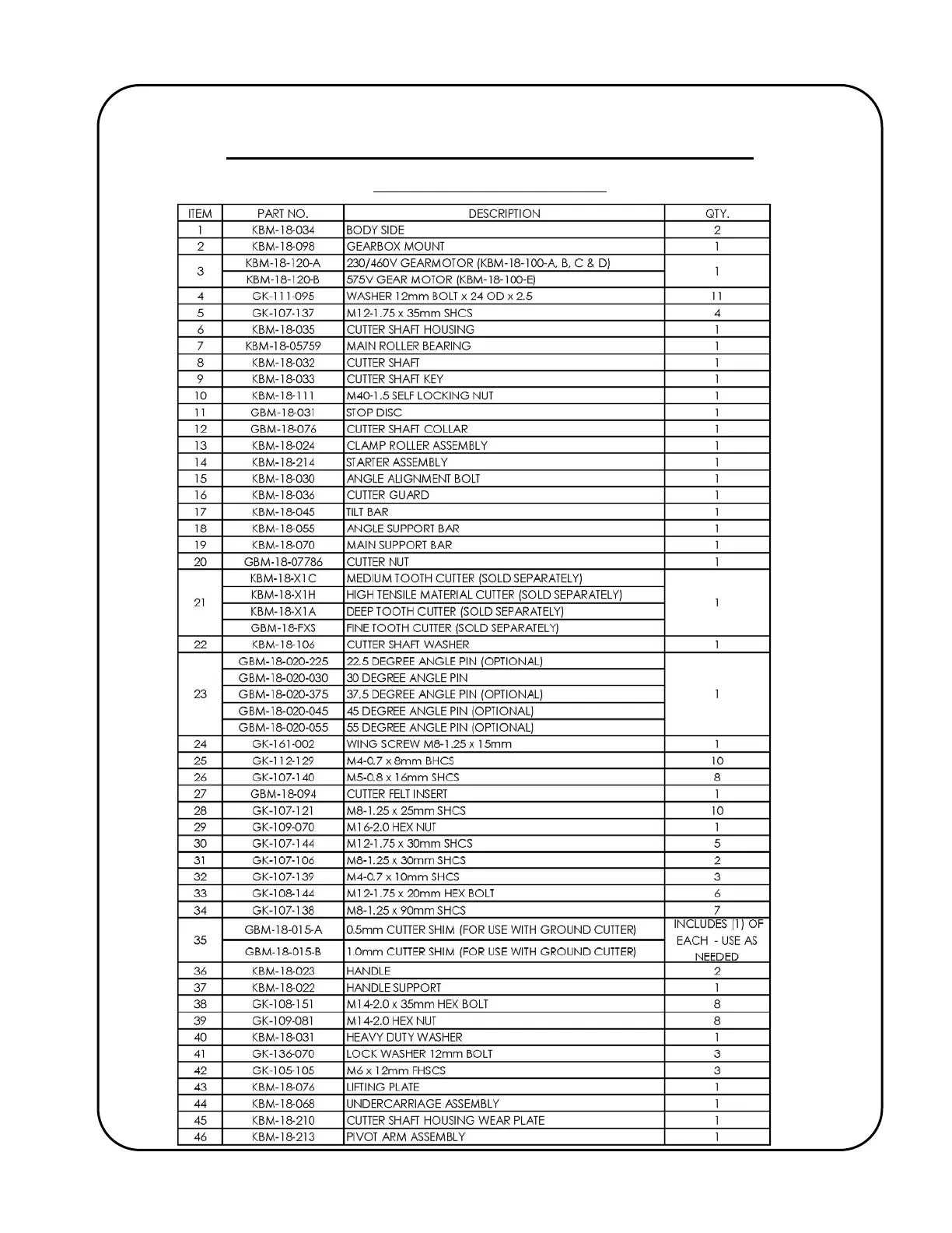 KBM®-18-100 GENERAL ASSEMBLY BREAKDOWN