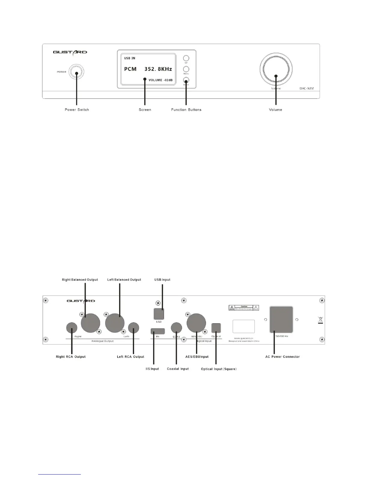GUSTARD DAC-X22 - Front Panel Introduction; Rear Panel Introduction