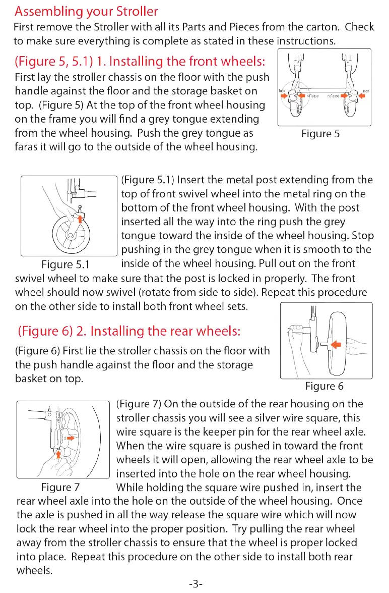 Guzzie+Guss G+G 042 - Assembling Your Stroller; Installing the Front Wheels; Installing the Rear Wheels