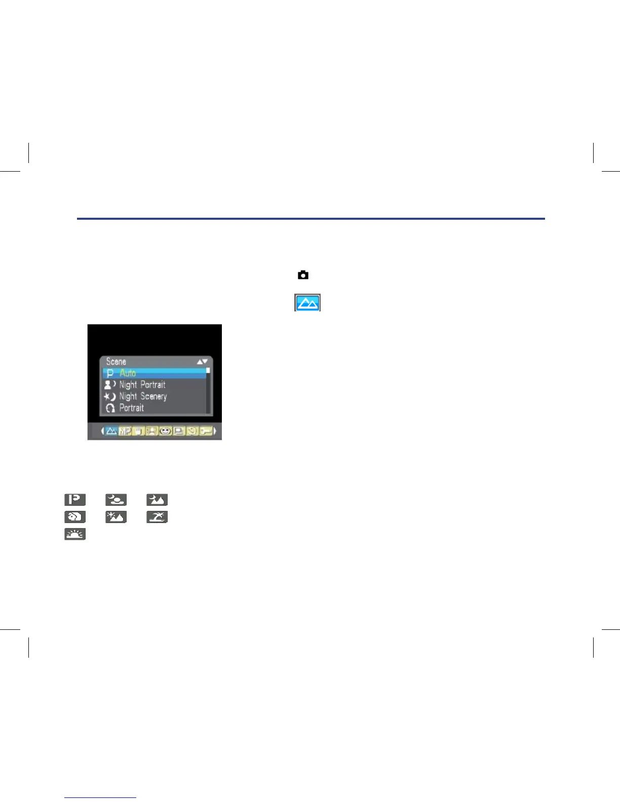 included with your camera. Such as Auto, Night Portrait, Night Scenery, Portrait, Scenery, Beach, High
