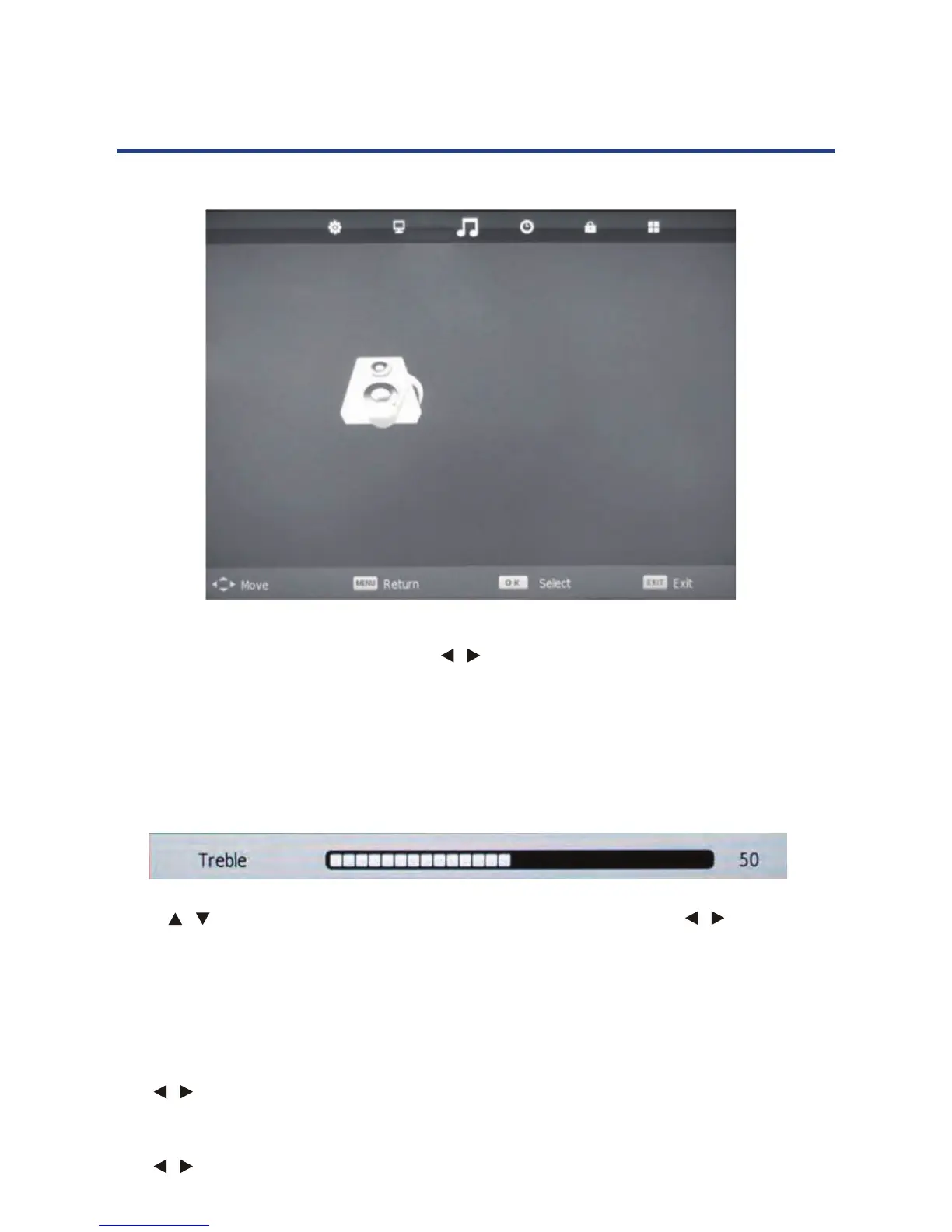 Use the / keys to switch between treble, bass and balance, then use the / keys to