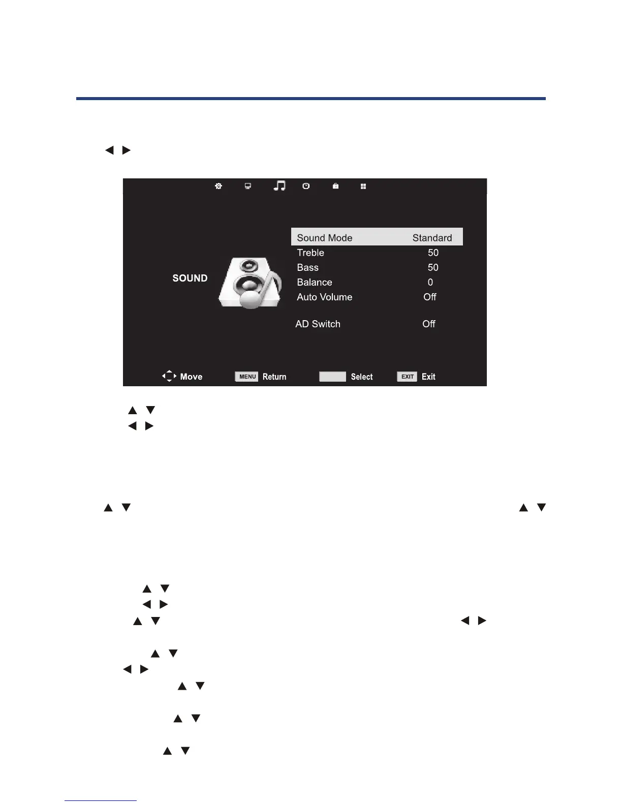 1. Press / button to select the option that you want to adjust in the SOUND menu.