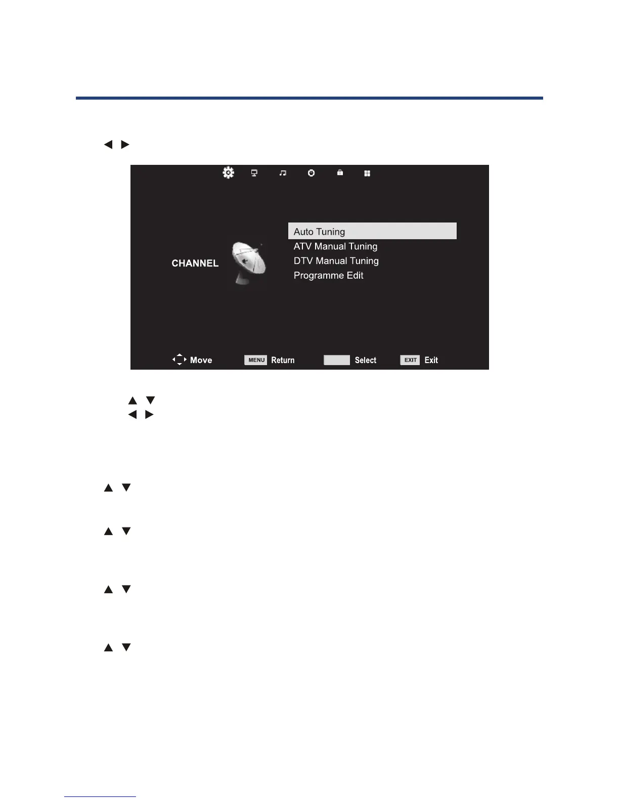 Press / button to select Auto Tuning, then press OK button to start auto search.
