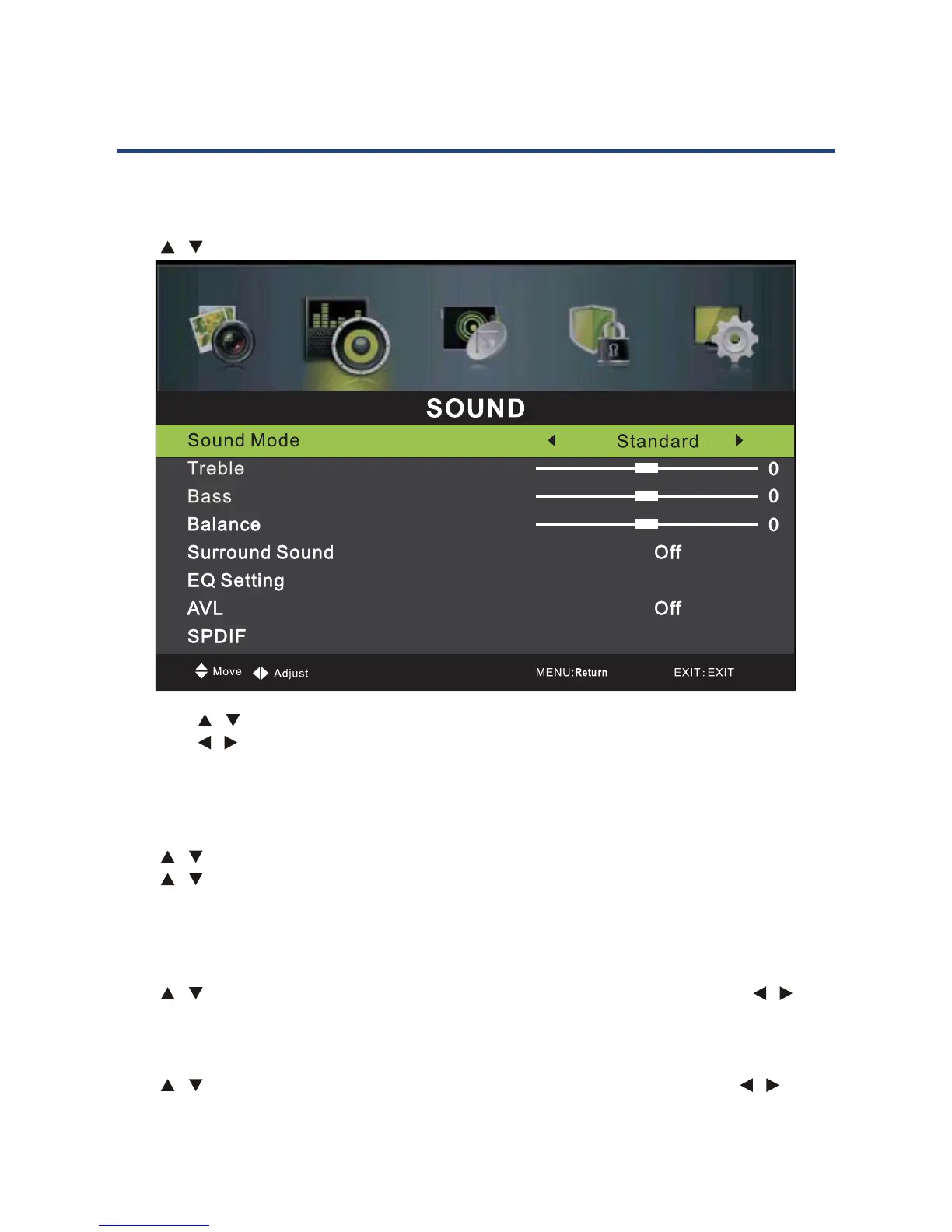 1. Press / button to select the option that you want to adjust in the SOUND menu.