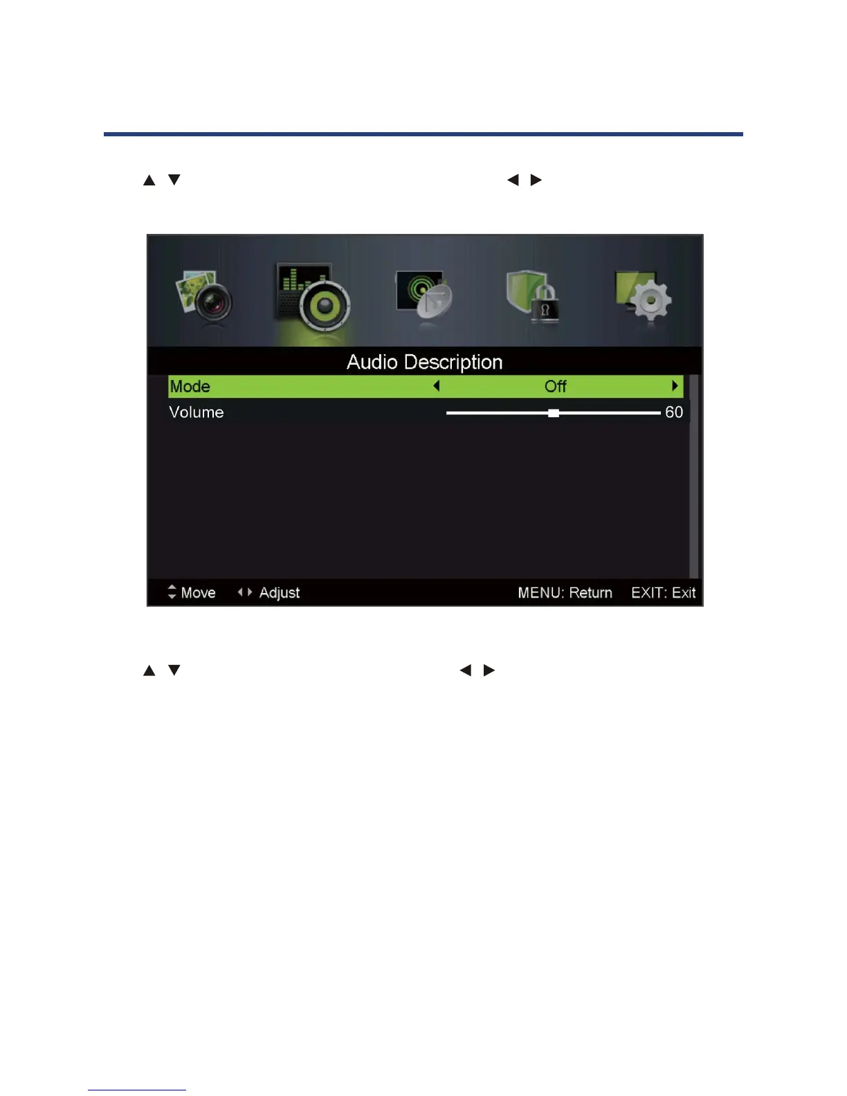 Press / button to select Audio Description, then press / button to select.