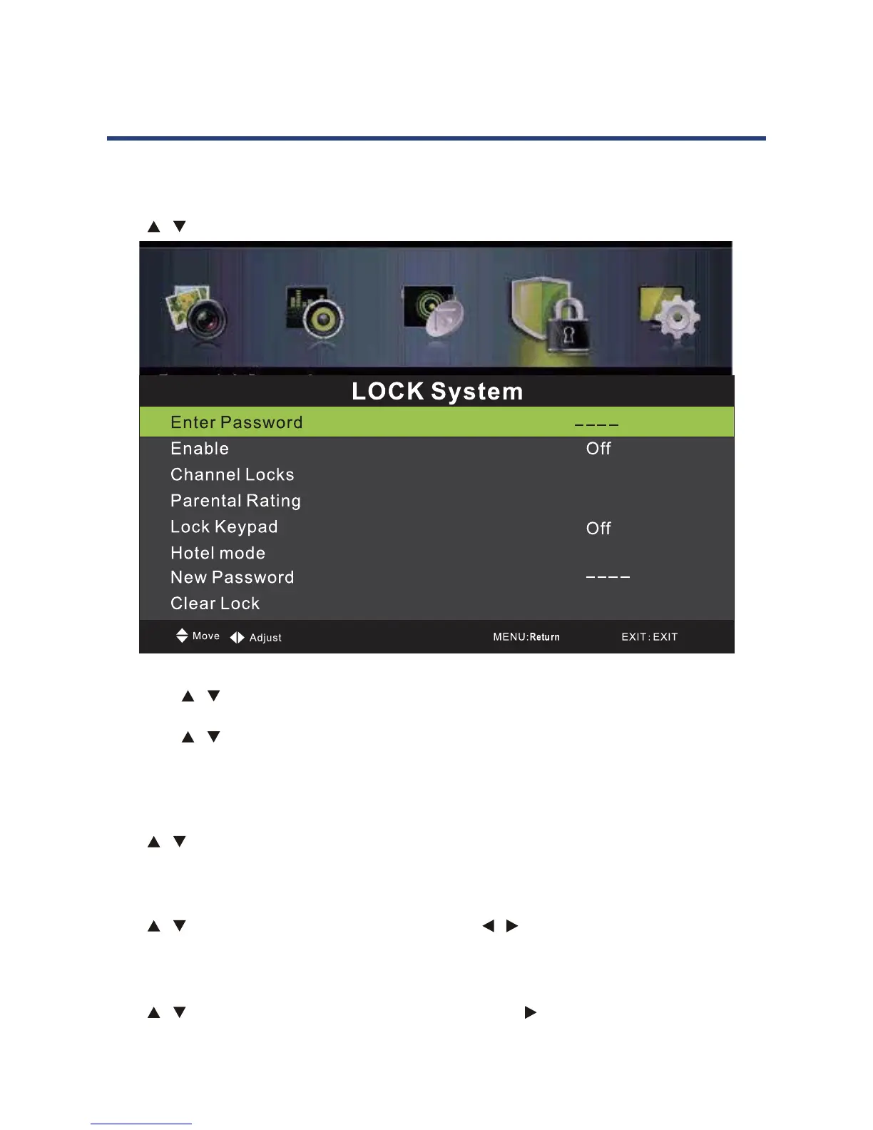 Locks,Parental Rating and Lock Keypad are available when Enable is On