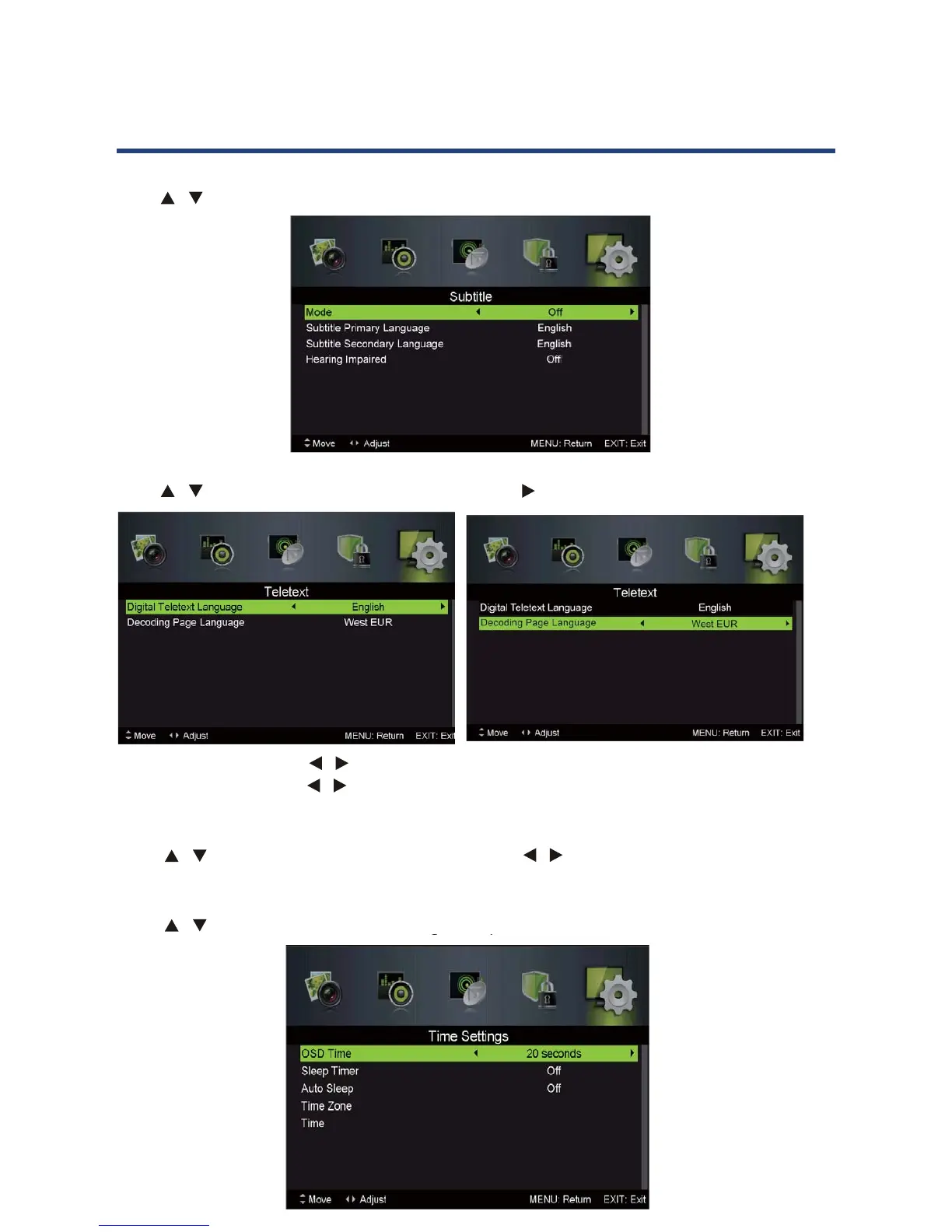 Press / button to select Teletext, then press OK / button to enter submenu.