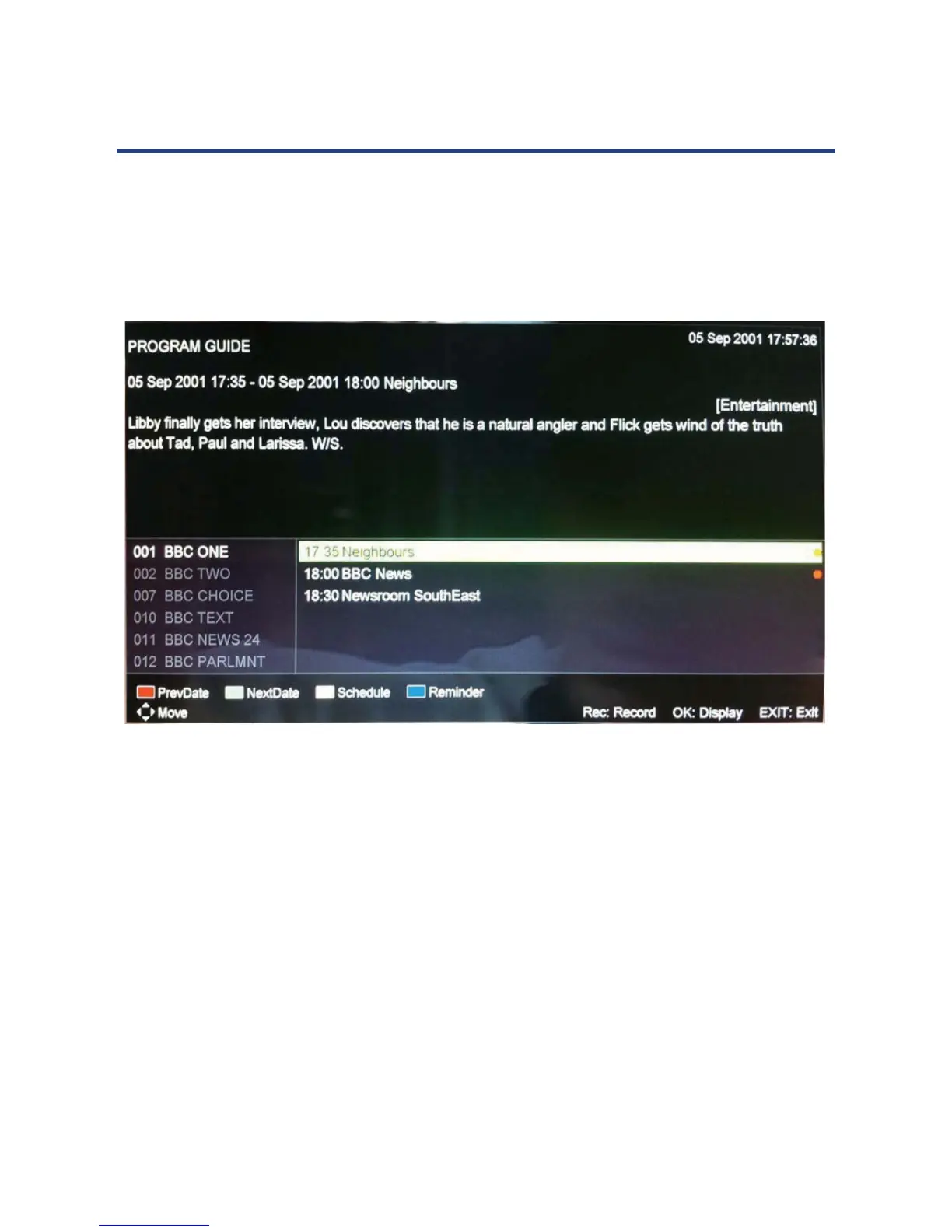 programmes list. Some seconds before the beginning of the programme, on the screen will