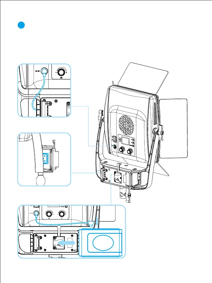 Plug in the battery, connect the lamp and the D-TAP port of the battery