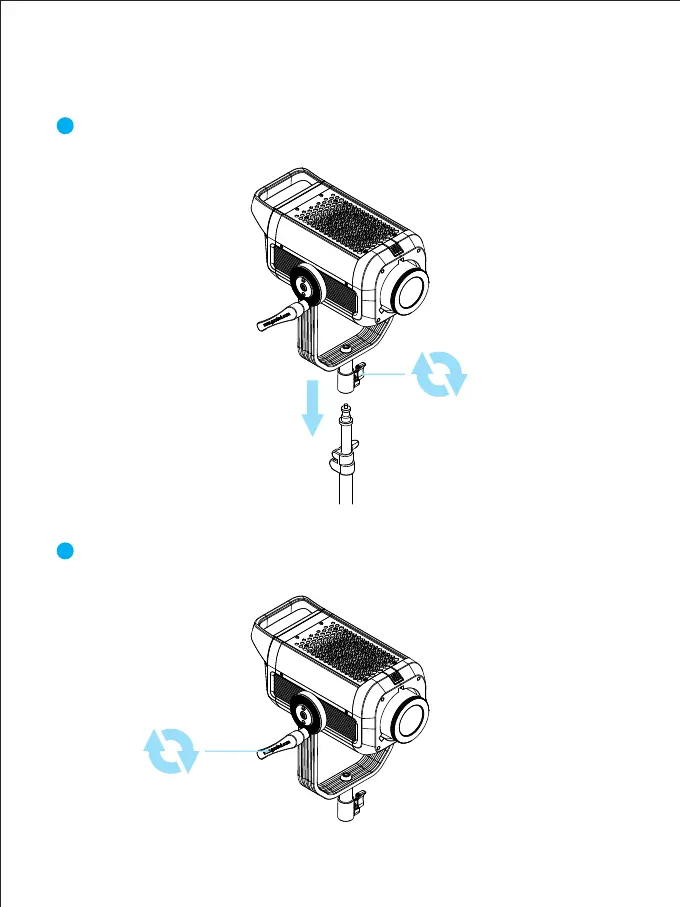 Loosen the light stand fixing knob, install the light to the light stand as shown