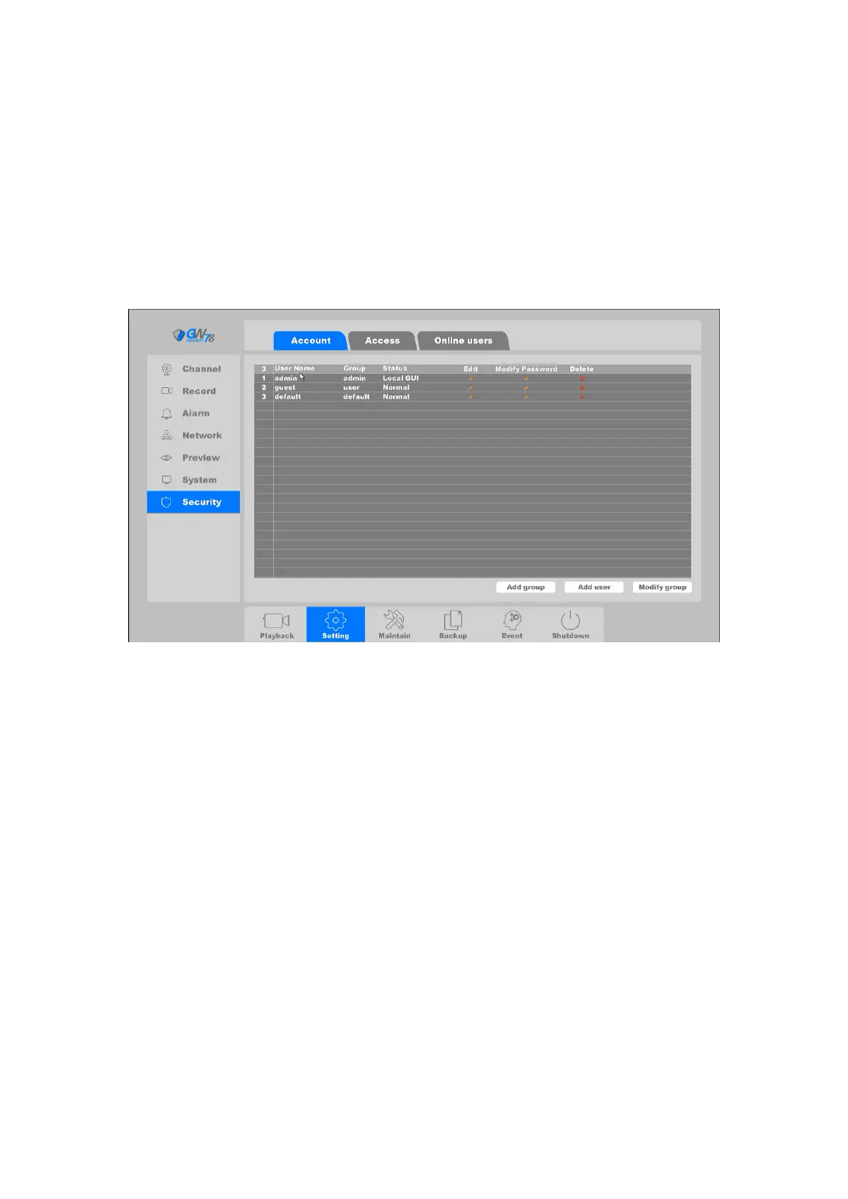 There are three default accounts in the NVR: admin/guest/default. The account of admin is an