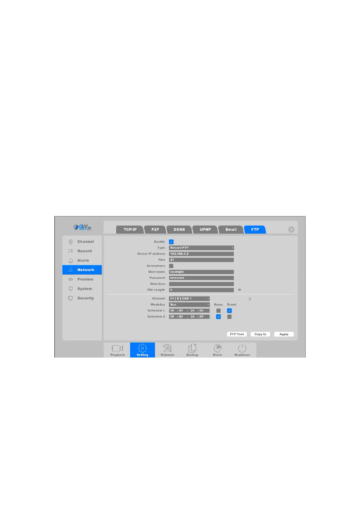 FTP setting: divided into video FTP and pictures FTP- you can set up your server IP, port,