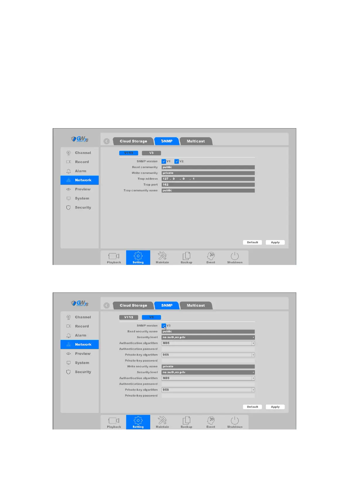 Click on "Setting -> Network ->SNMP". There are 3 versions in SNMP. V1/V2 are shown in figure