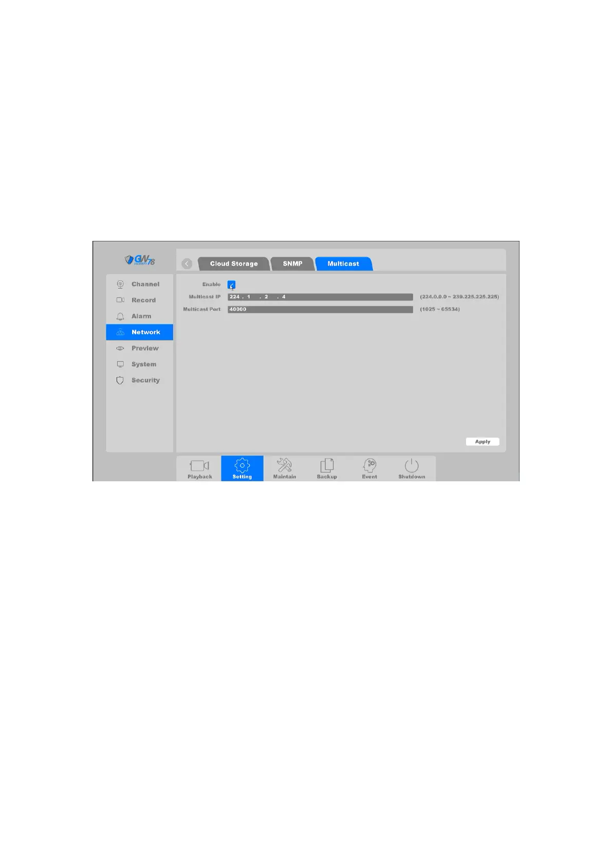 Click on "Setting -> Network → Multicast, as shown in figure 4-34. Set the Multicast IP and