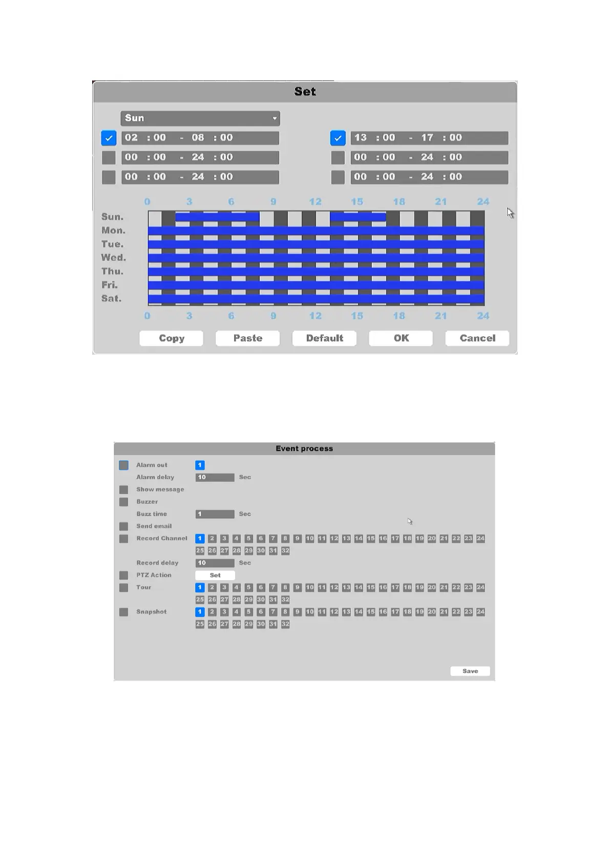 alarm delay, show massage, buzzer, send Email, record channels, record delay, PTZ act, tour,