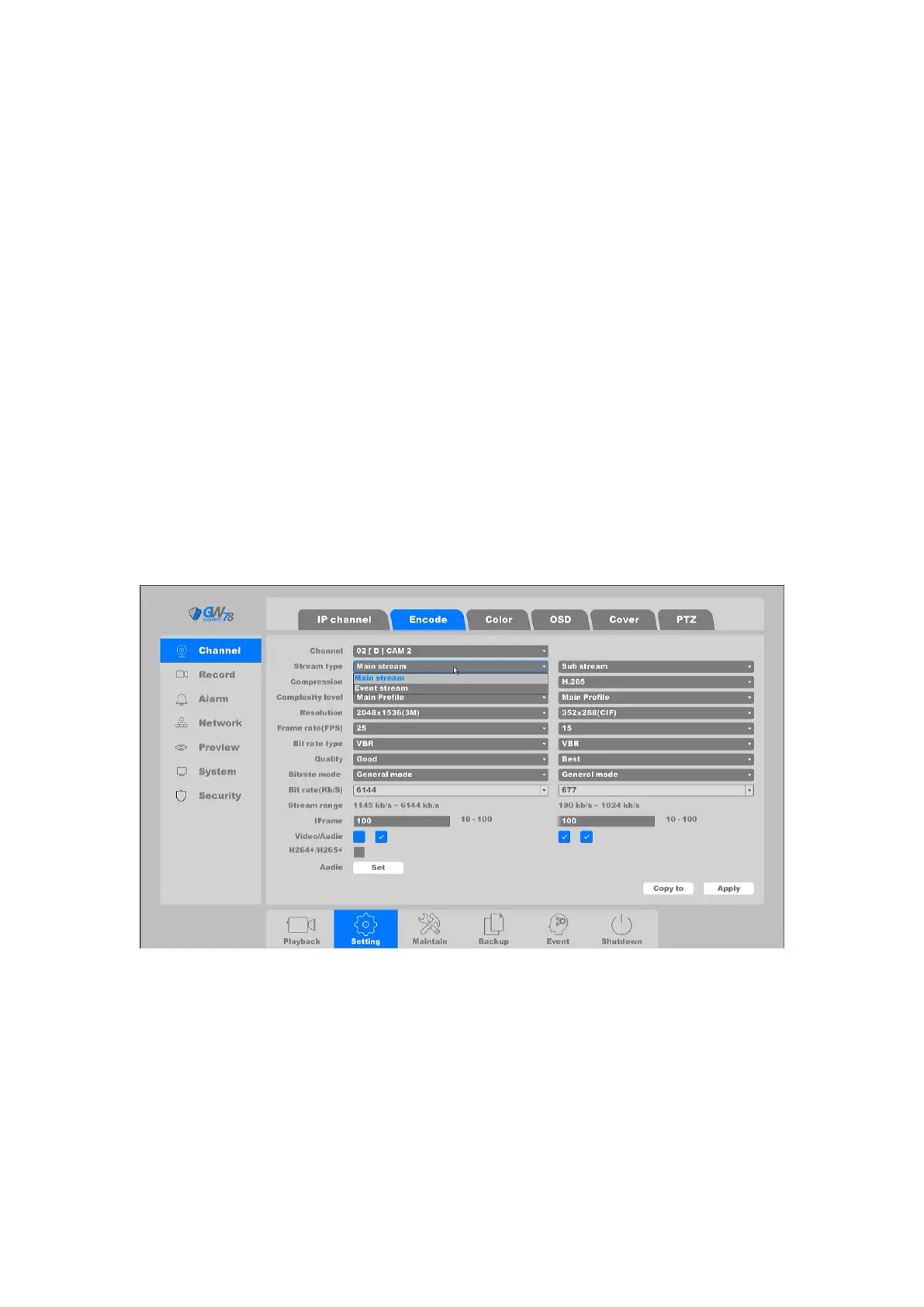 The NVR supports Dual Stream Encode, we can set the main stream encode and sub stream