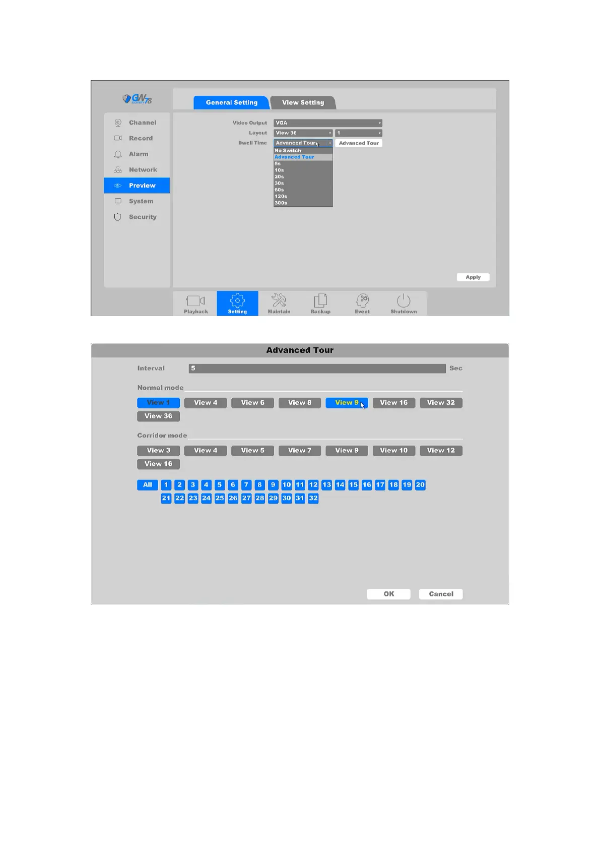 HDMI output NVR, you can also set which cameras show on HDMI1 and which cameras show on