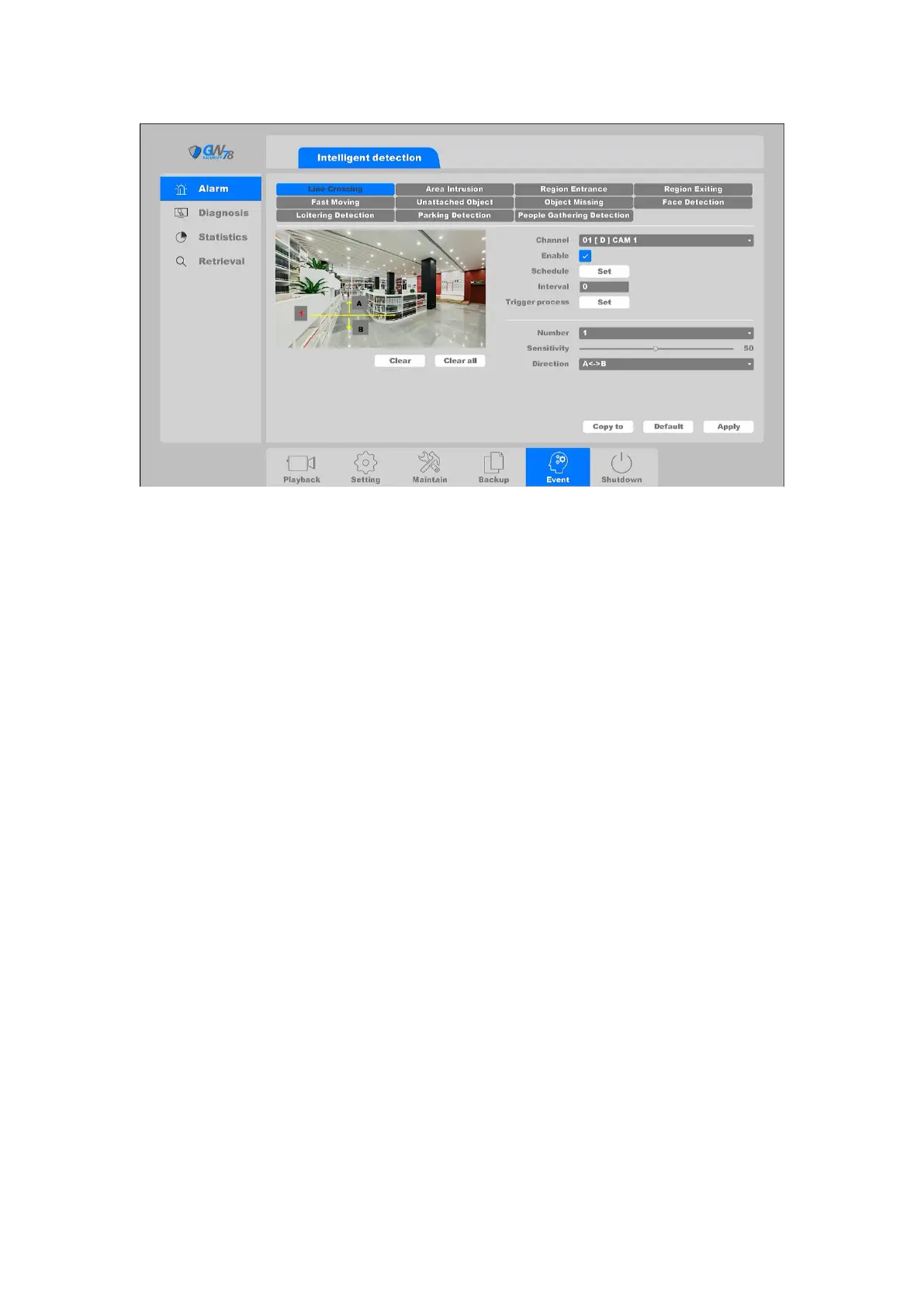 Schedule: Set the time slot to detect crossing. You can take the setting of chapter