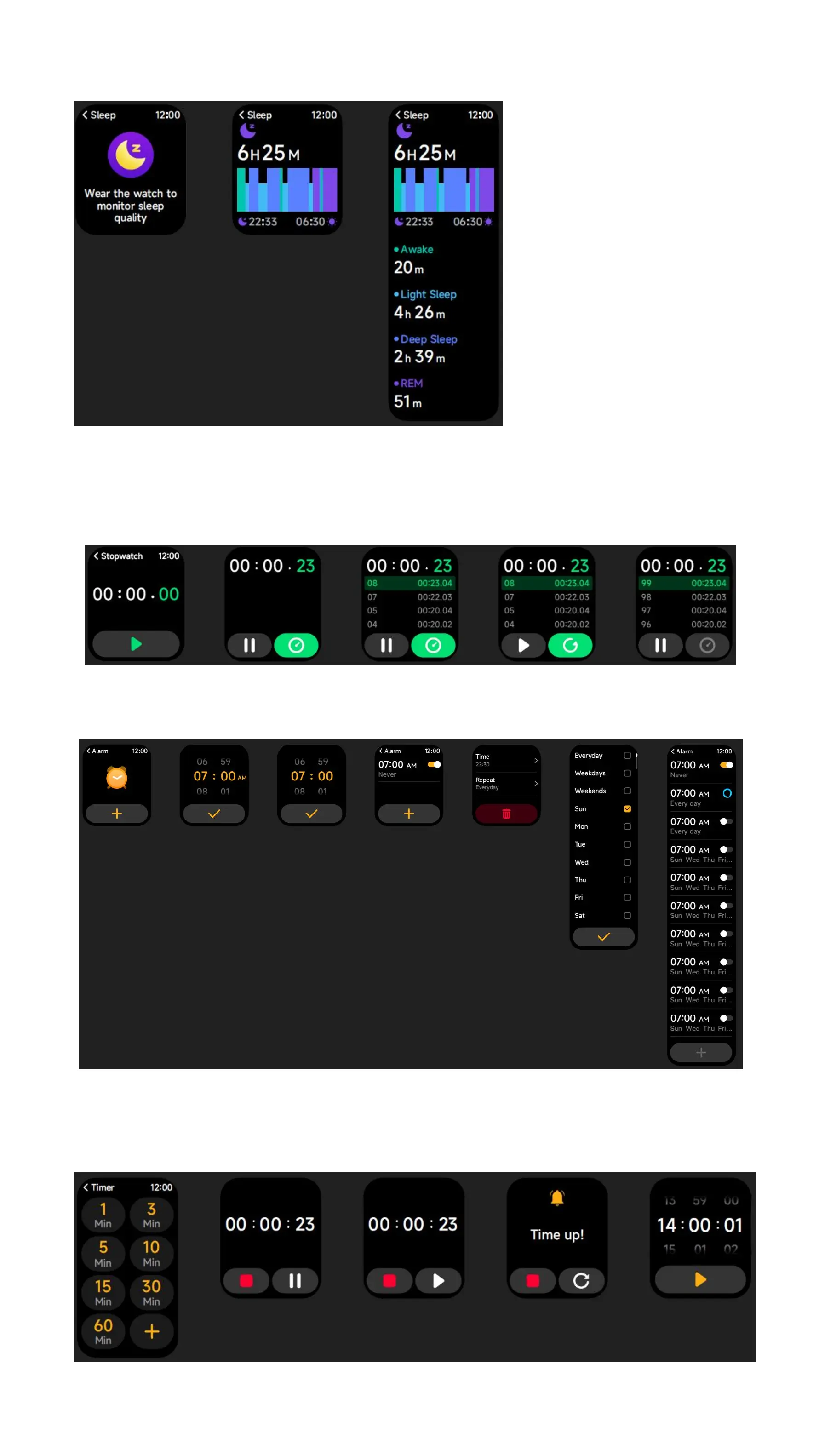 1. You can add, delete an alarm, or turn the alarm on/off on the watch, and also set an alarm for the watch via the app.
