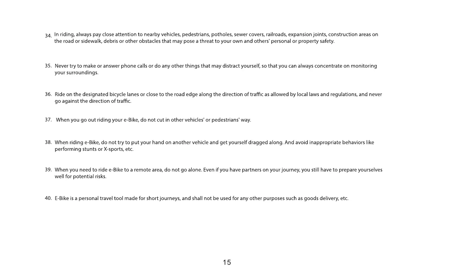 37. When you go out riding your e-Bike, do not cut in other vehicles' or pedestrians' way.