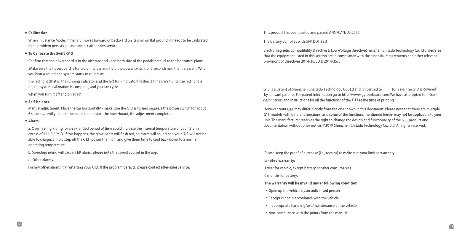 Gyroor G13 - Calibration and Alarms; Calibration Procedure; Swift G13 Calibration Steps; Self-Balance Adjustment