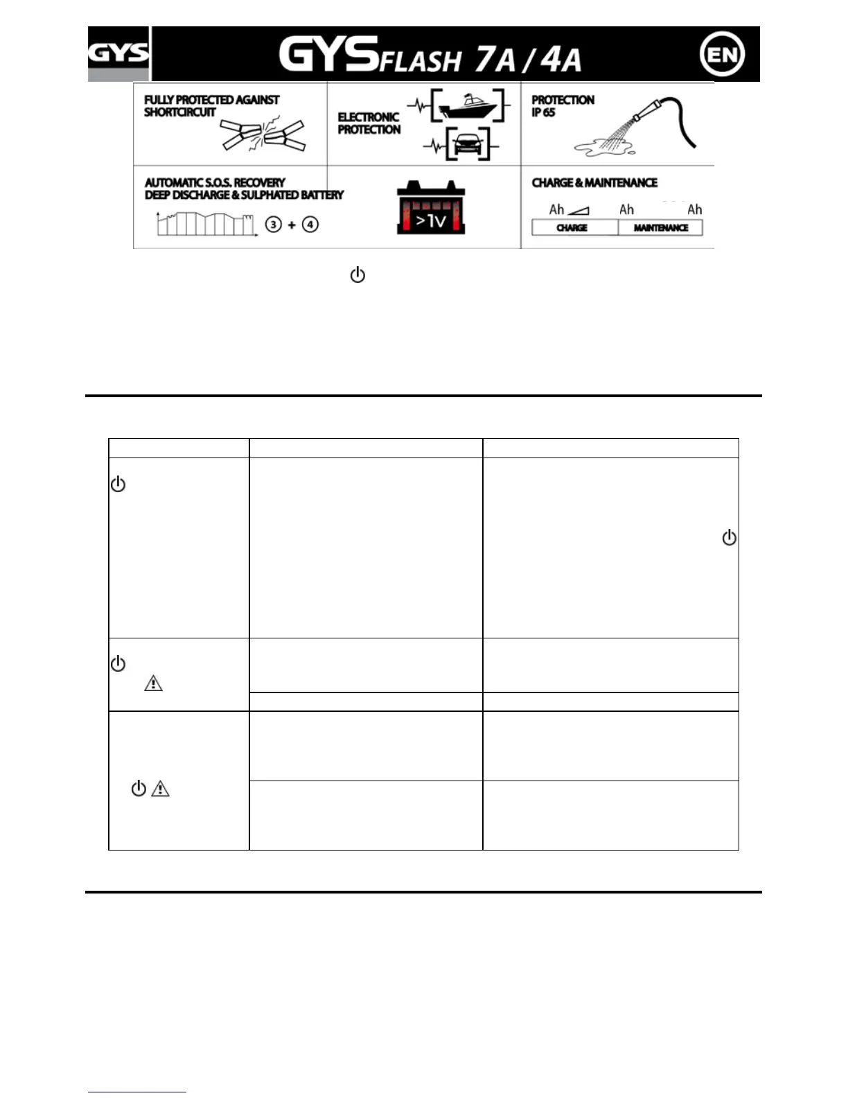 GYS GYSflash 4A - Troubleshooting Problems; Power Indicator Illuminates; Indicator On and Flashing; Both Indicators On