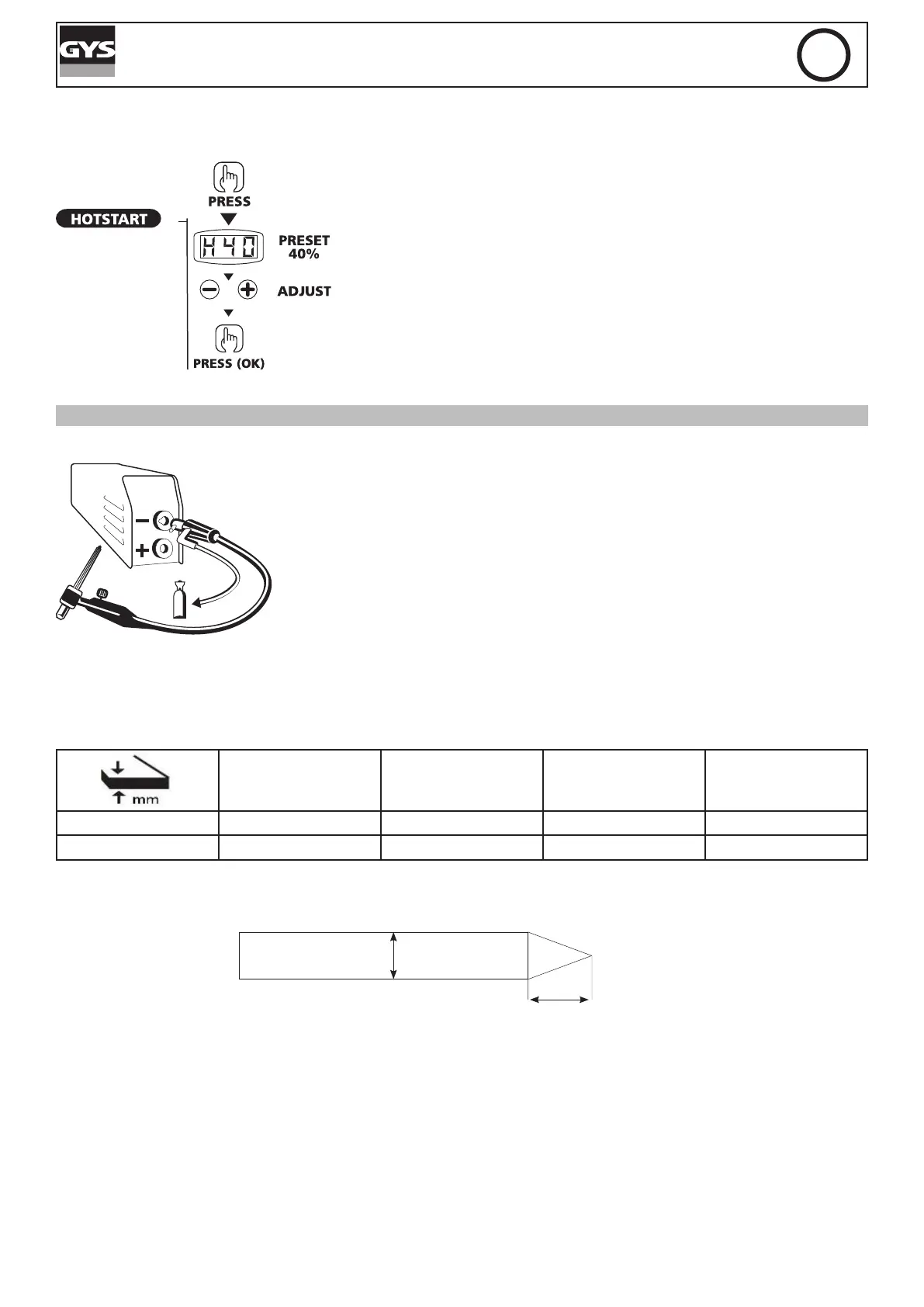 To optimise the welding process, it is recommended to grind the electrode prior to the welding, as described below: