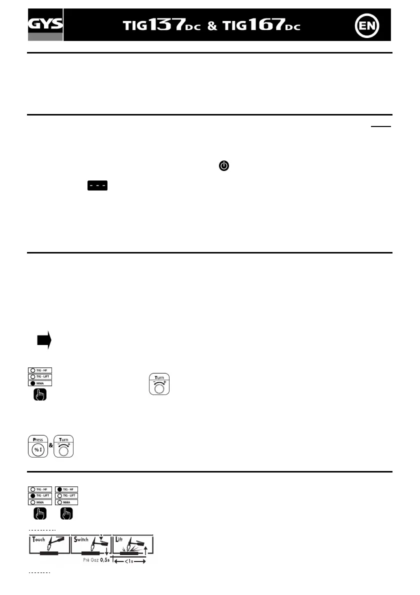 • Behaviour of the ventilator : in MMA mode, the ventilator permanently works. In TIG mode, the ventilator only