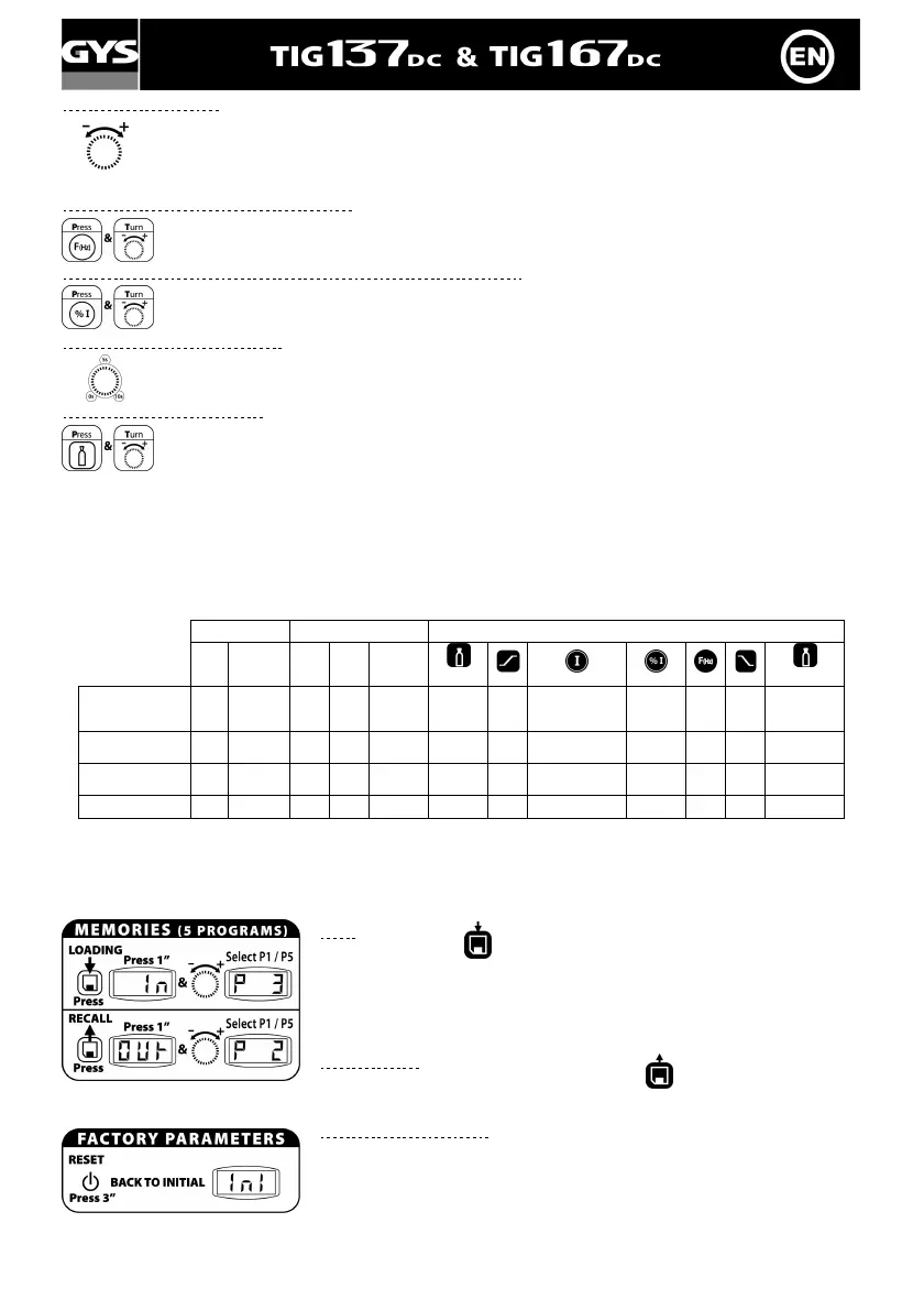 There are 5 memories to save and recall TIG parameters. On top of these memories, GYSMI 137/167 stores your last