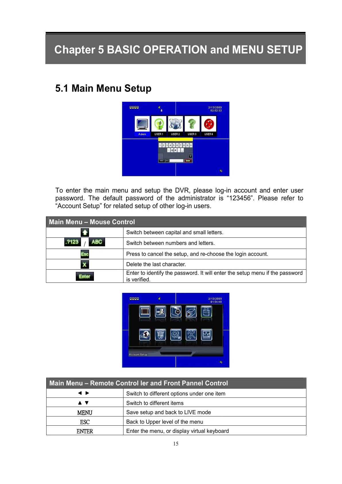 To enter the main menu and setup the DVR, please log-in account and enter user