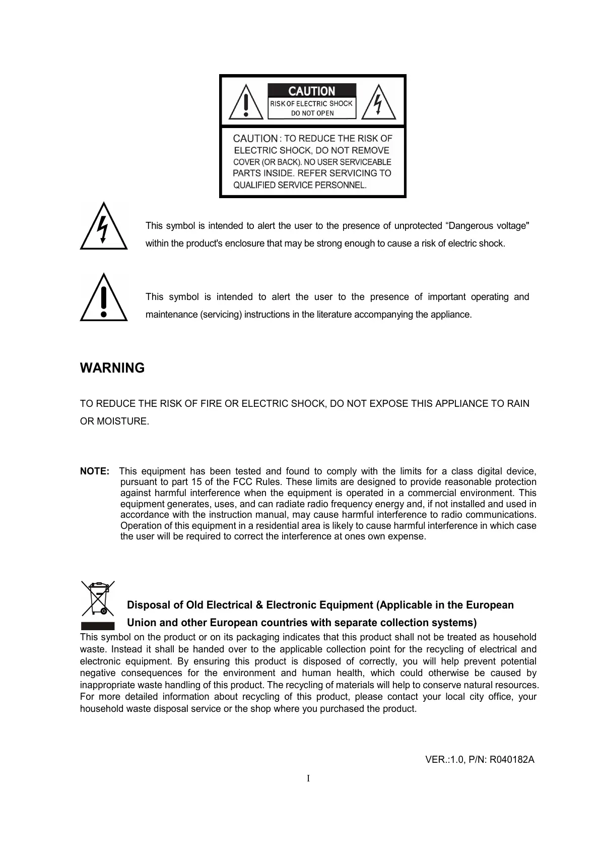 TO REDUCE THE RISK OF FIRE OR ELECTRIC SHOCK, DO NOT EXPOSE THIS APPLIANCE TO RAIN