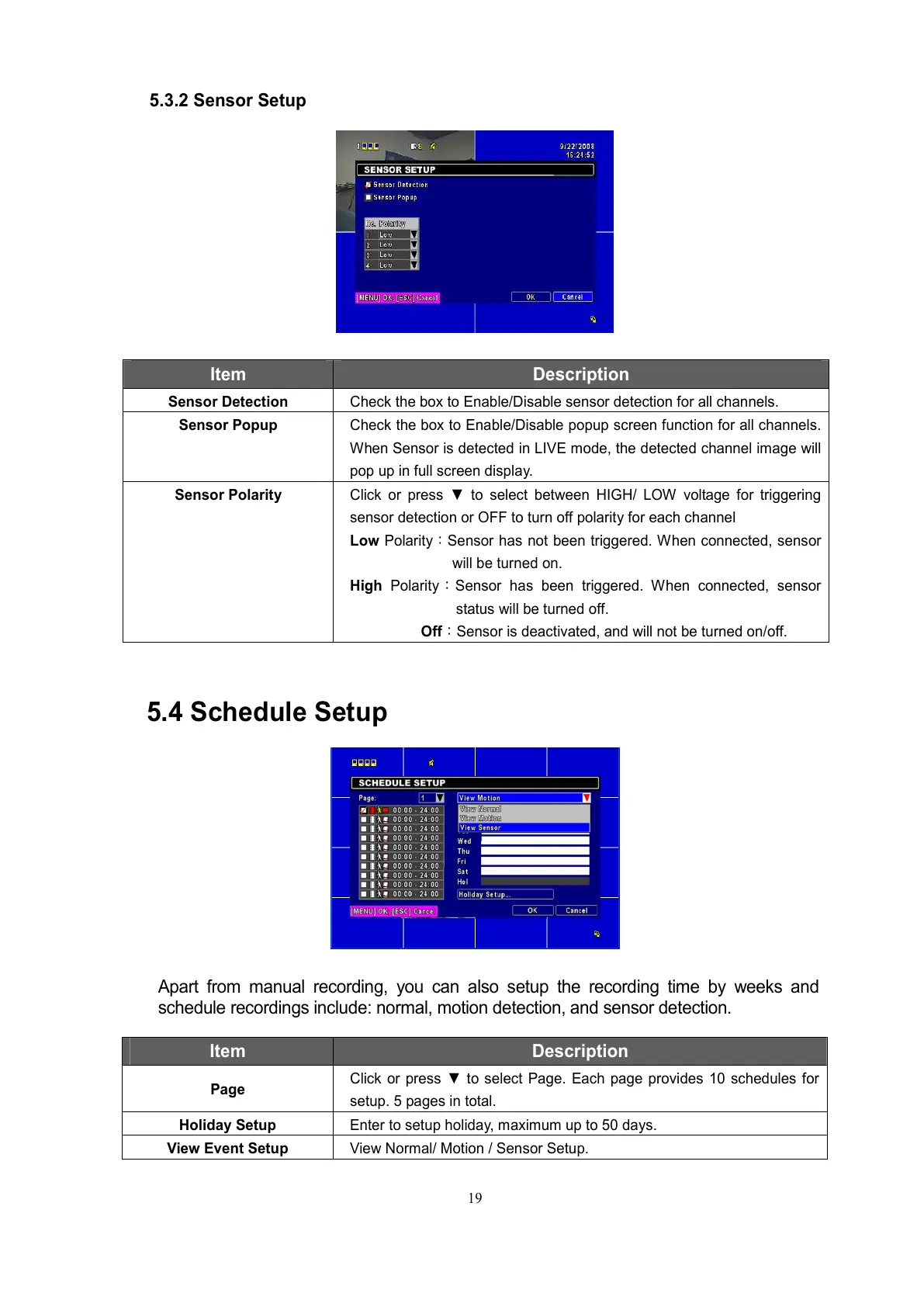schedule recordings include: normal, motion detection, and sensor detection.