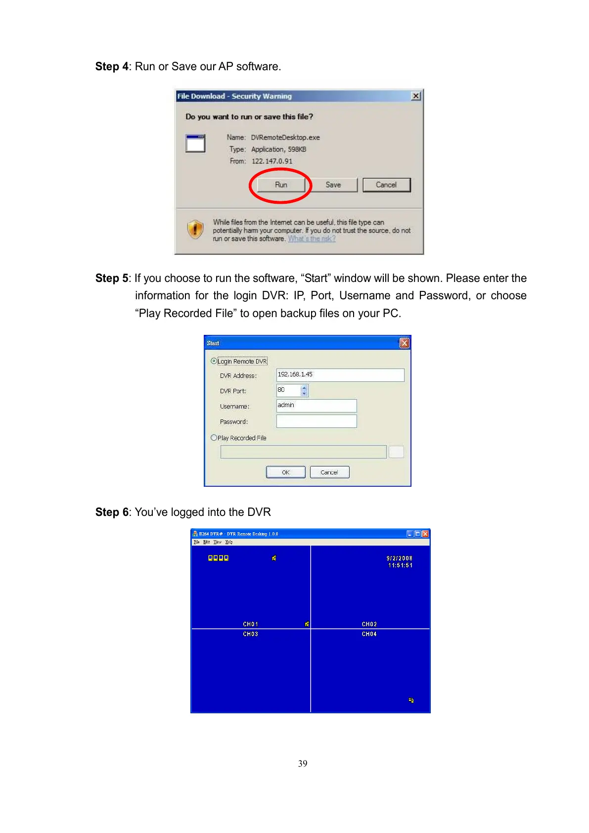 information for the login DVR: IP, Port, Username and Password, or choose