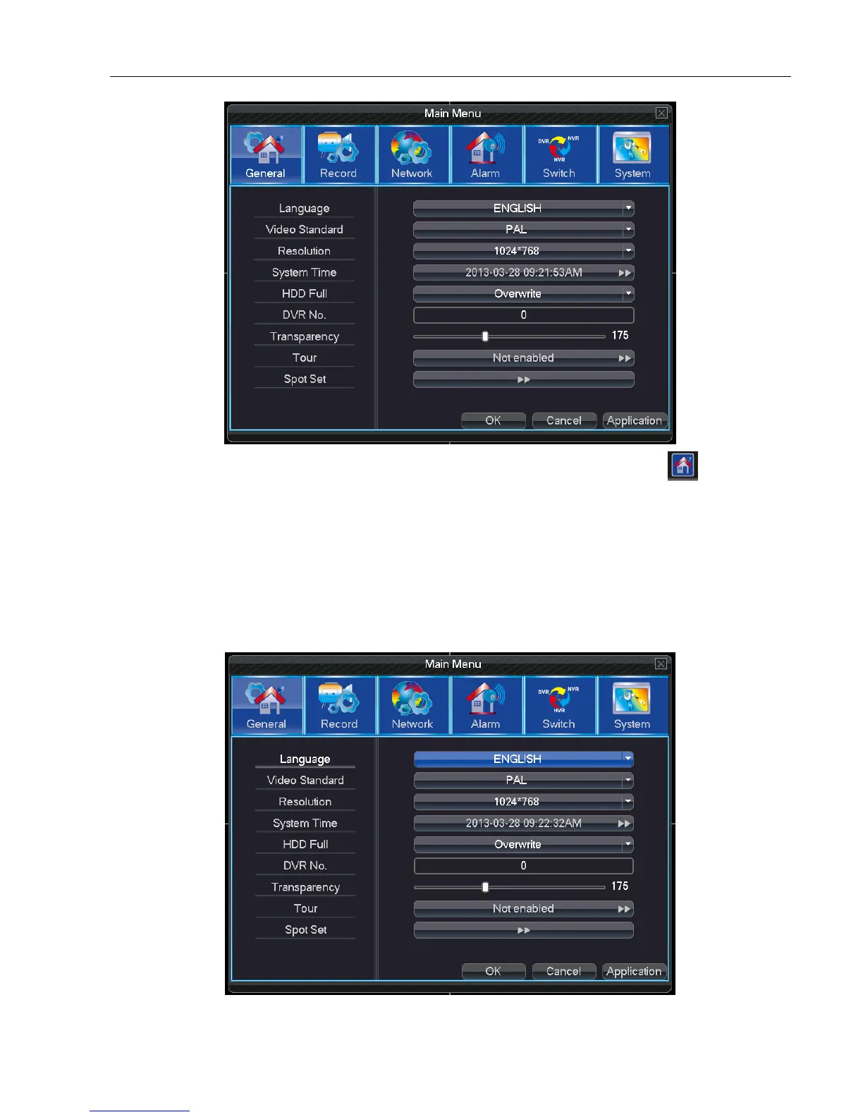 enter main menu interface as picture 5-2. In main menu can configure general, record, network, alarm, switch(some