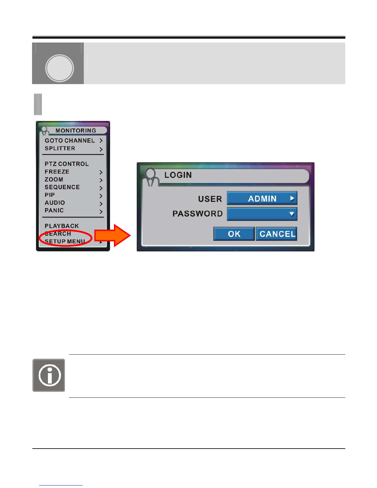 2) ClickSETUP MENU” and Login window pops up.