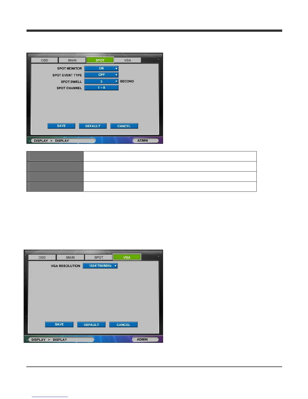Users can configure VGA type monitor in VGA Tab window. DVR must have VGA Card pre installed (Optional purchase