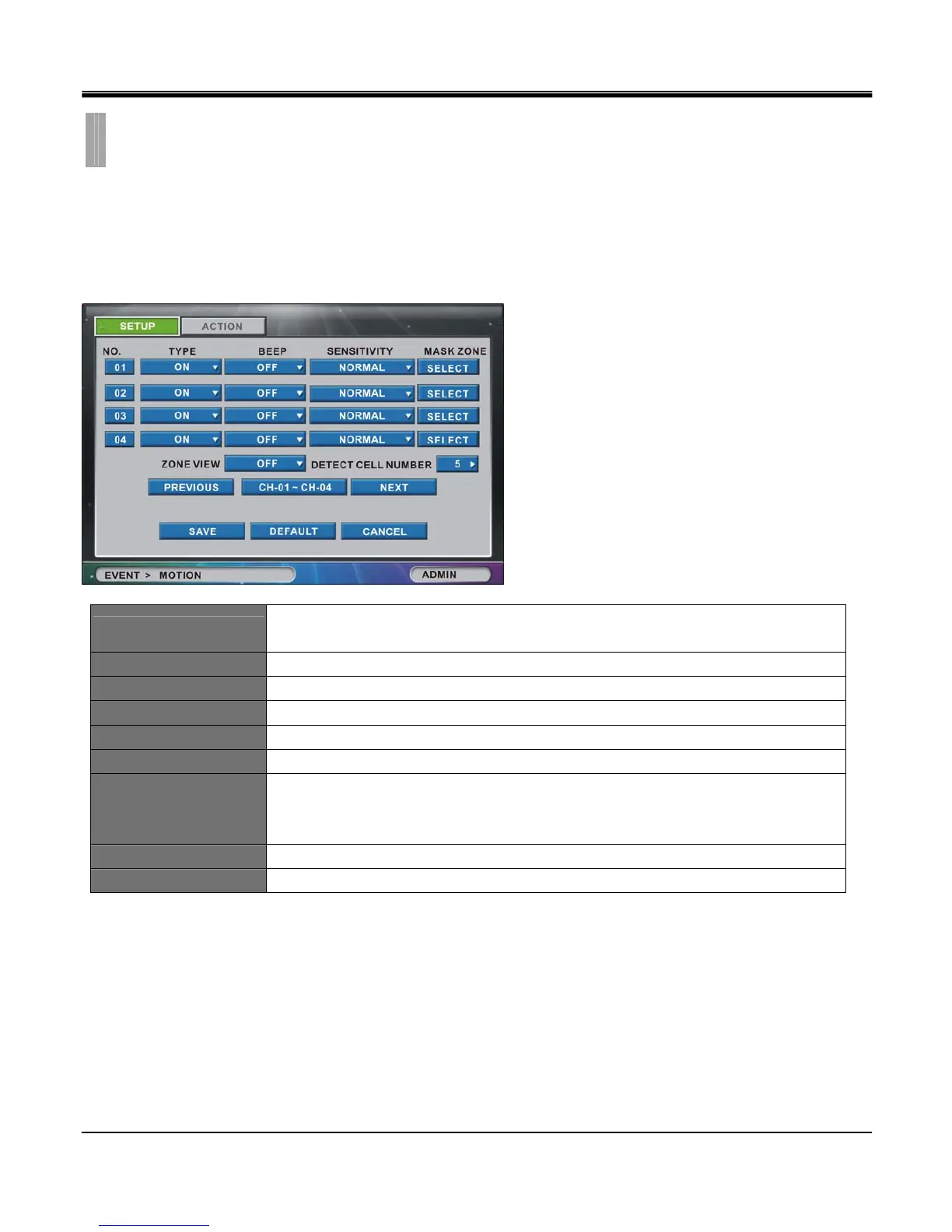 Beep Set beeping sound “ON” or “OFF” in case motion event occurs.