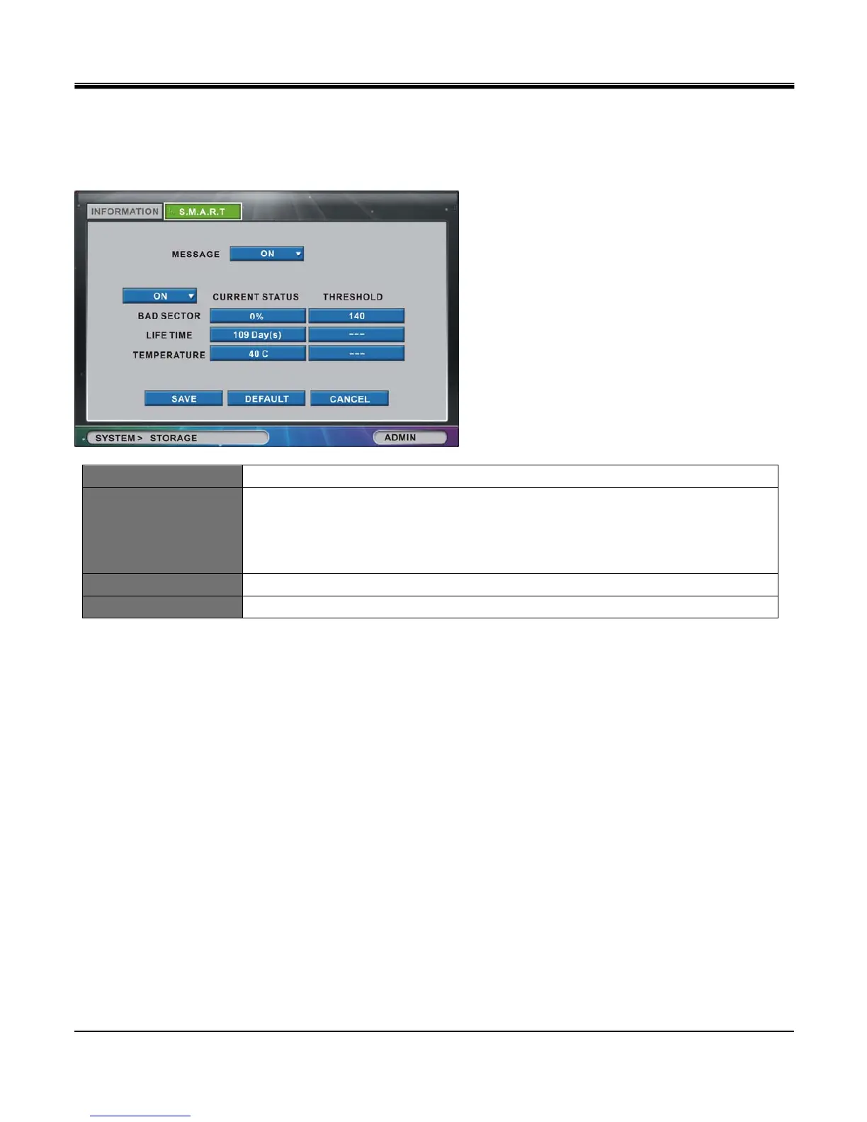 It displays information for HDD, BAD SECTOR and LIFE TIME for each and TEMPERATURE information for each HDD.