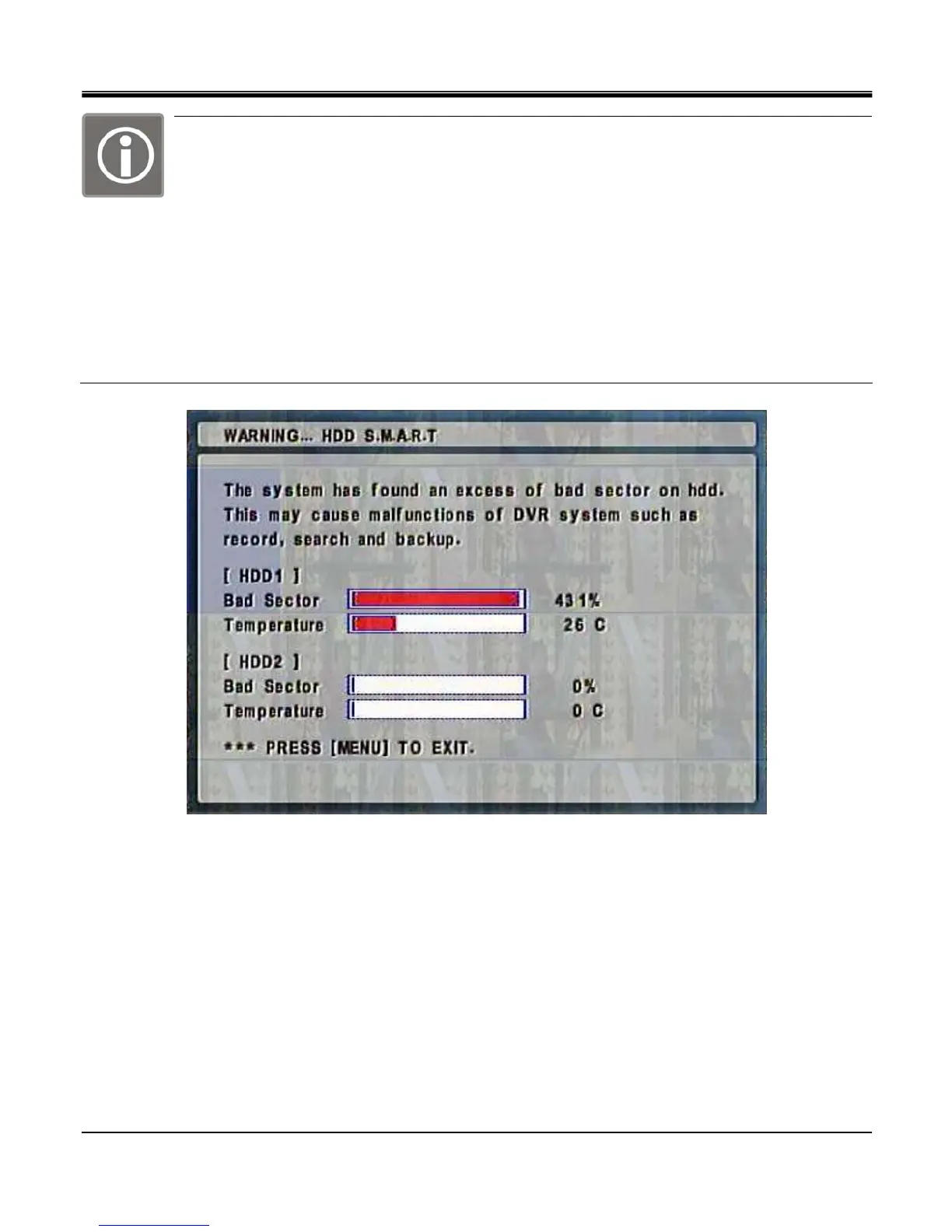 4) The below message is shown Bad Sector percentage on CURRENT STATUS go over 100% at playback
