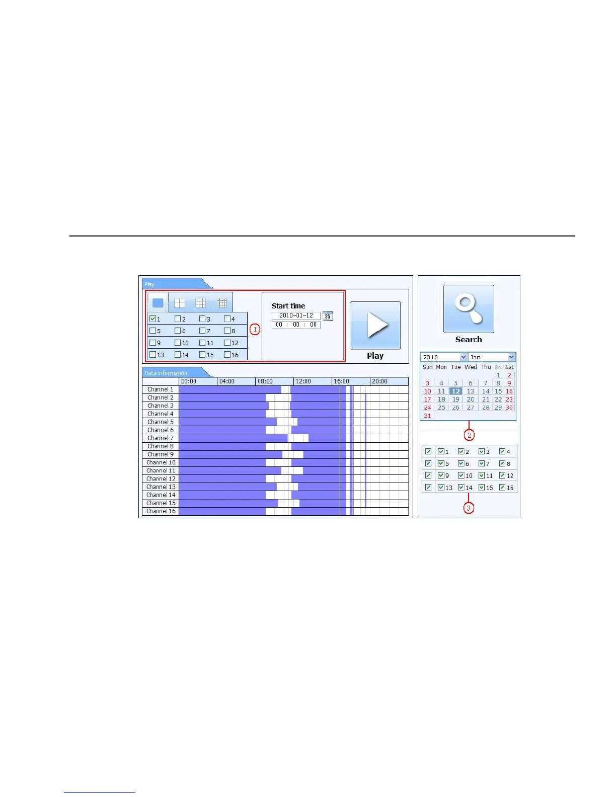Step2: click “Search” button. The record data will be displayed in the data information list box; the highlight date in the area② means have record