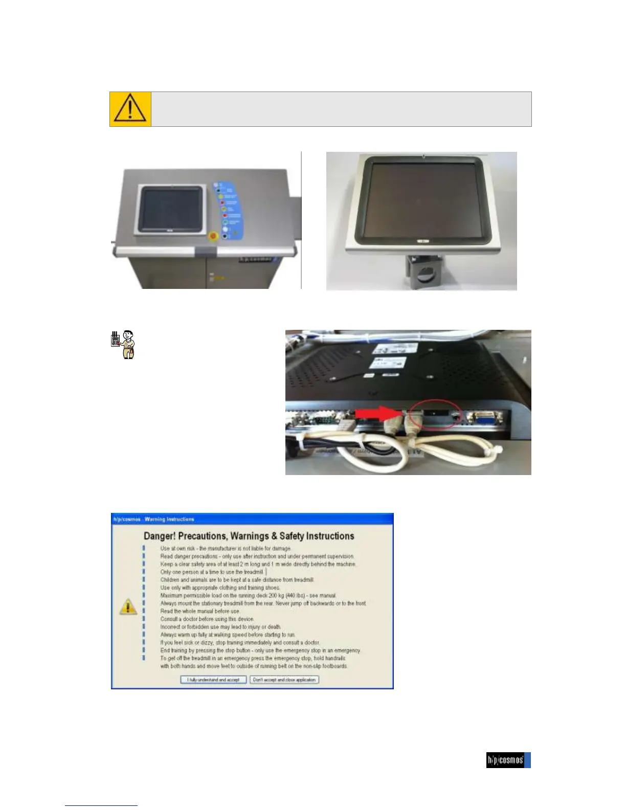 After booting up, h/p/cosmos para control will start automatically and show these safety instructions.