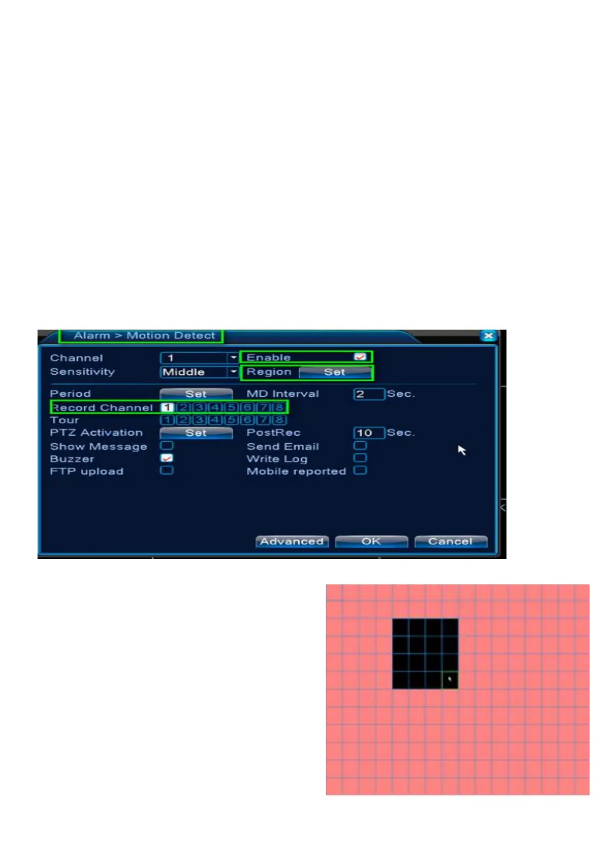 select < Sensitivity >, < Region >, < Record Channel >, < Buzzer >, < Send Email > according to