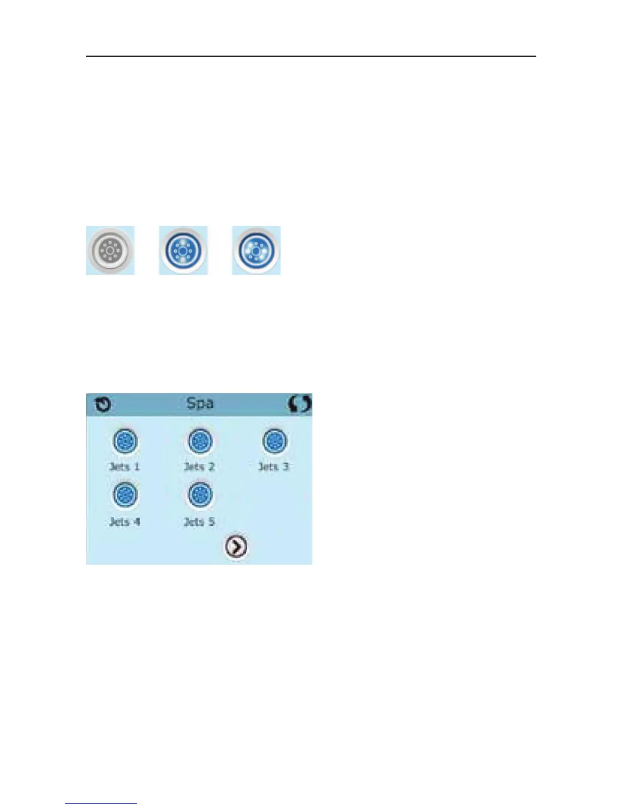 The Spa Screen shows all available equipment* to control. The display shows icons that are related